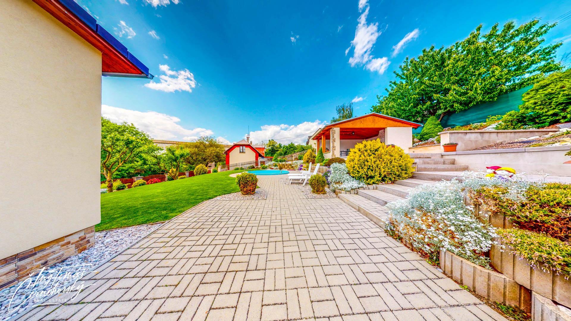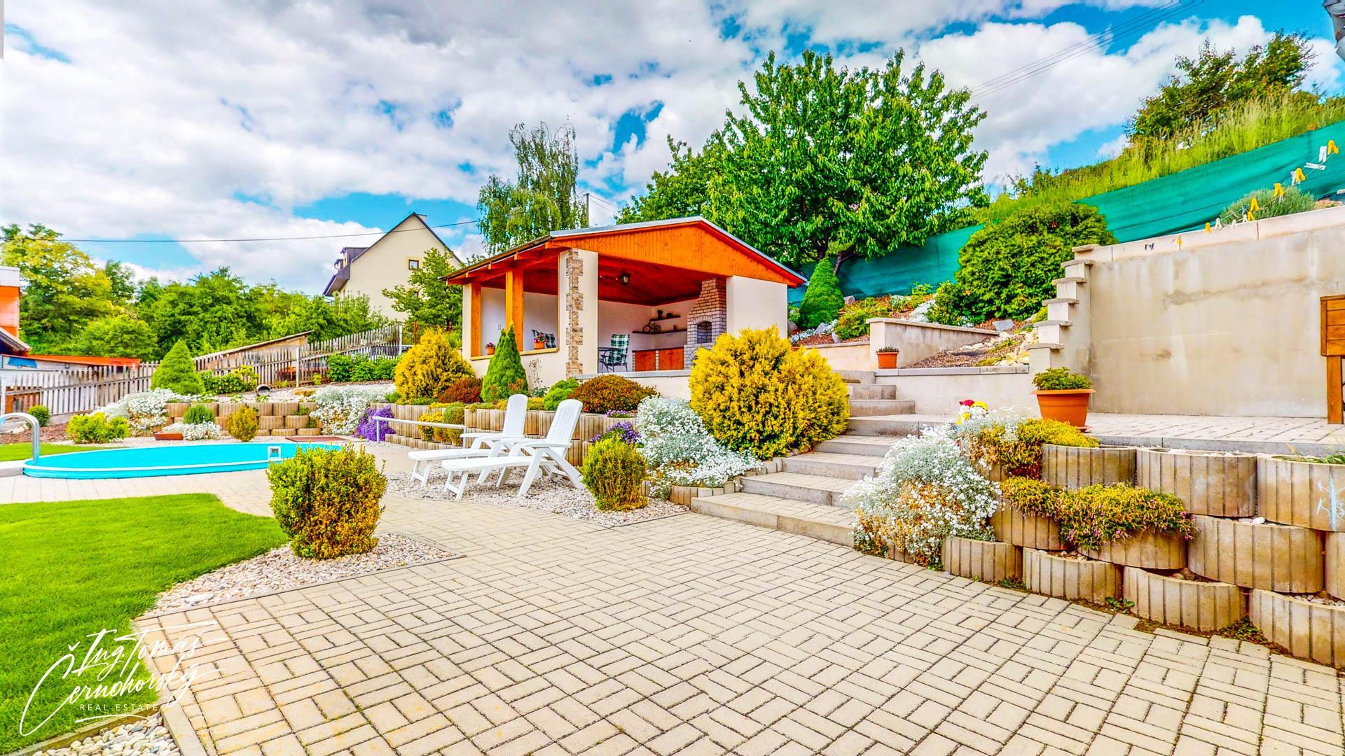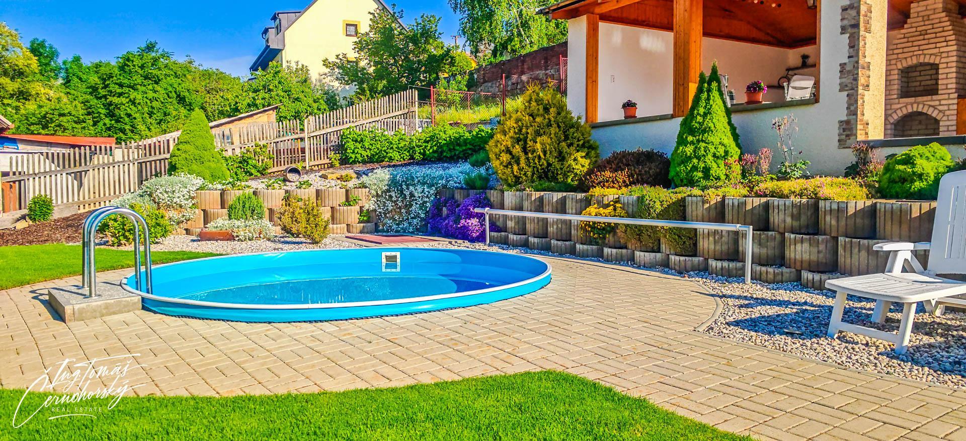 Na pečlivě udržované zahradě se nachází zapuštěný bazén, zastřešené posezení s venkovním krbem a několik kůlen, které nabízejí praktický úložný prostor pro nářadí, kola, dřevo nebo sezónní vybavení. Vše je ve velmi dobrém technickém stavu a připraveno k okamžitému užívání bez nutnosti dalších investic.