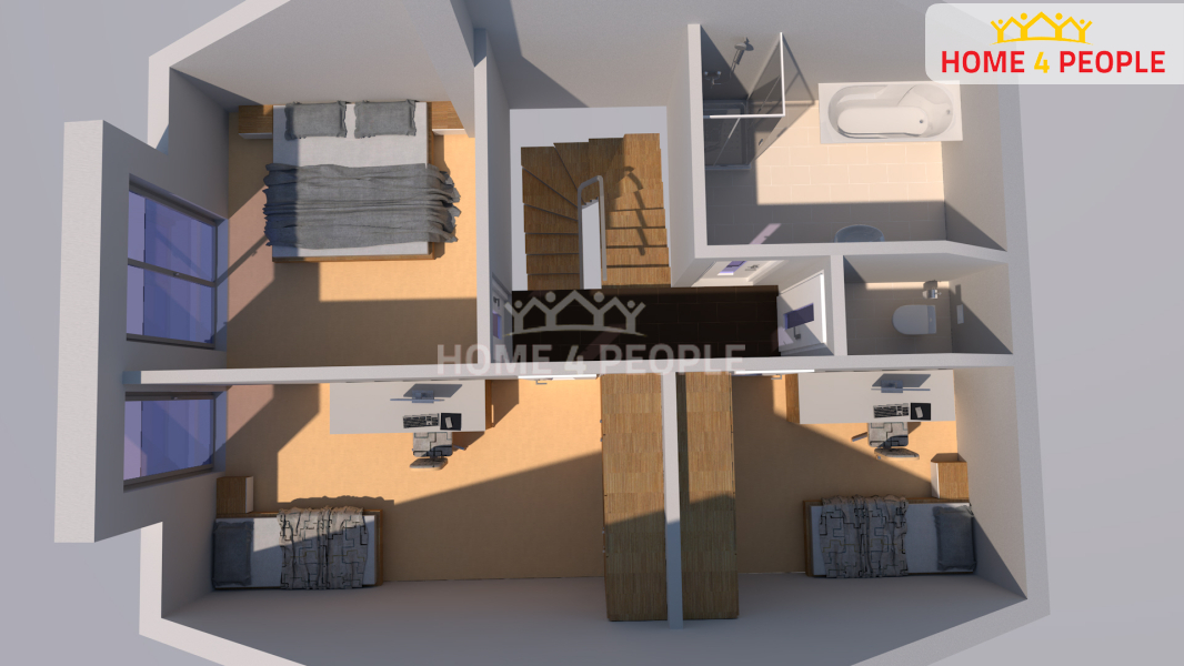 V přízemí se nachází prostorné zádveří (3,87 m²), které vás uvítá a provede do chodby (2,73 m²). Dále zde naleznete technickou místnost (2,34 m²) a velkorysý obývací pokoj s kuchyňským koutem (41,46 m²), ideální pro rodinné oslavy a společenské chvíle. Z obývacího pokoje je přístup na terasu (15 m²), kde si můžete užívat slunečné dny. Přízemí doplňuje praktické WC (1,65 m²). V druhém nadzemním podlaží se nachází chodba (3,86 m²) a tři ložnice – jedna (11,55 m²) a druhá (13,71 m²) pro pohodlné spaní, a třetí (9,66 m²), kterou lze využít jako pracovnu. Koupelna s vanou (7,4 m²) a samostatné WC (1,65 m²) zajišťují maximální komfort pro celou rodinu.