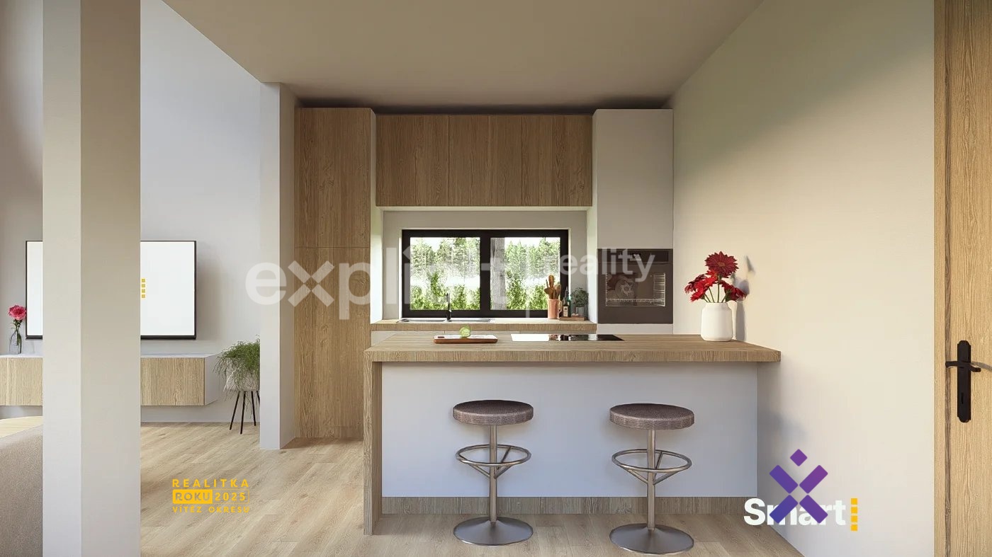 V přízemí domu naleznete velkorysé zádveří s prostorem pro vestavěné skříně, koupelnu s WC a sprchovým koutem, pokoj využitelný jako ložnice či pracovna, samostatnou šatnu a prostorný obývací pokoj s jídelnou a kuchyňským koutem. Dominantou obývacího prostoru je otevřený krov do patra a celoprosklená stěna, která zajišťuje dostatek denního světla.
