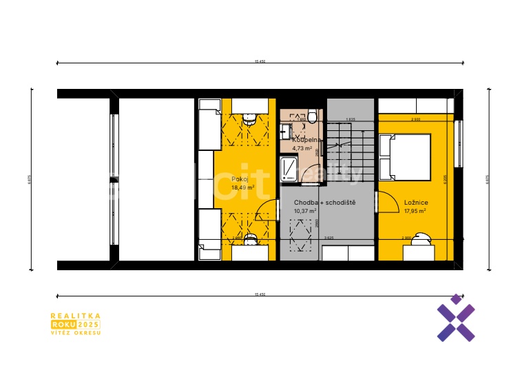 Patro domu nabízí ložnici s pracovním koutem, dětský pokoj, koupelnu se sprchovým koutem a WC a chodbu s úložnými prostory. Celková užitná plocha domu činí 129 m².