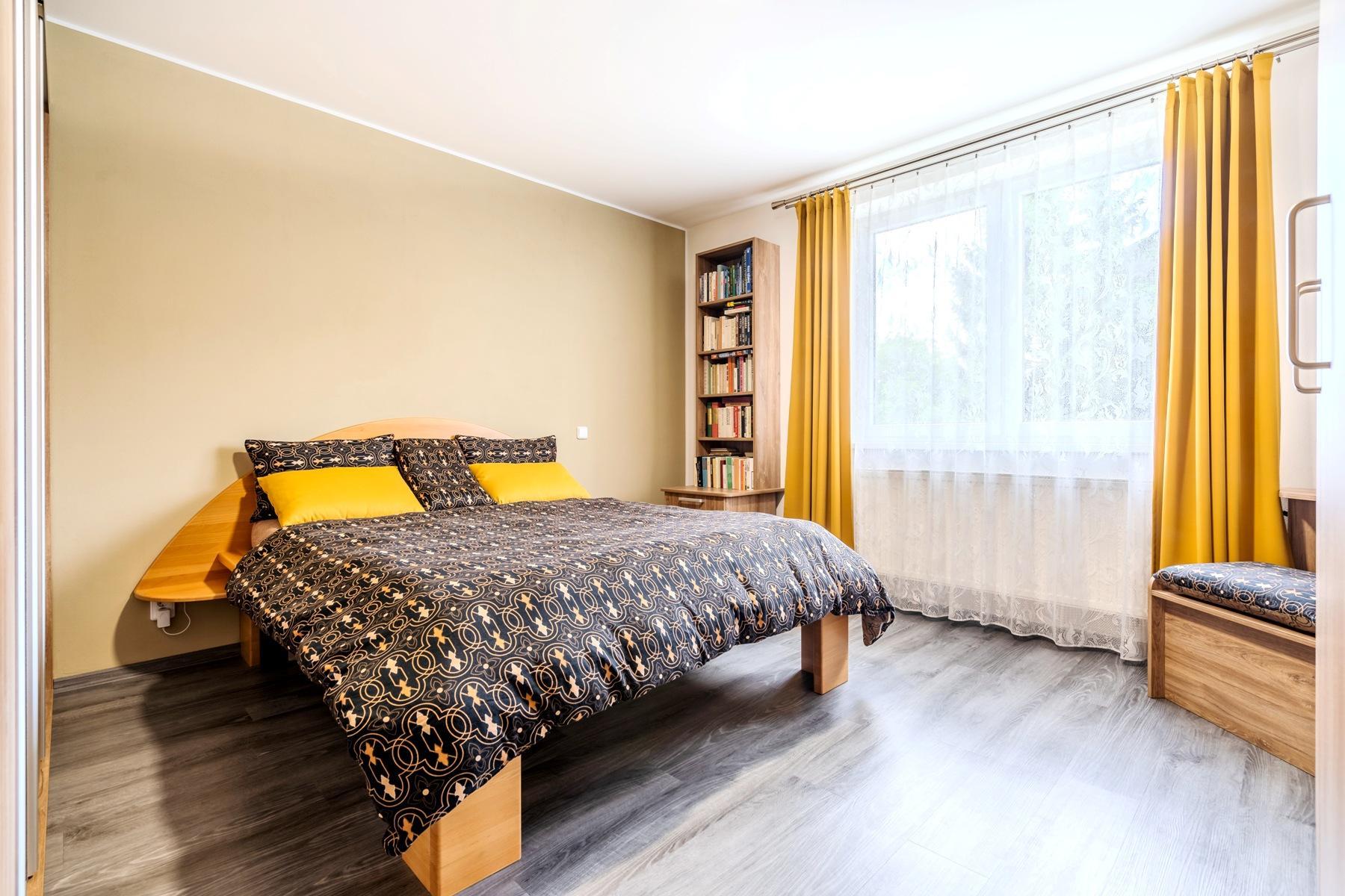 Byt o dispozici 3kk a s užitnou plochou 78 m2 se nachází v rodinném domě se třemi bytovými jednotkami. K bytu náleží zahrada o velikosti 235 m2 s přístupem do ulice a dvě parkovací stání před domem, u kterých je vybudován vjezd na zahradu. V přízemí se krom vstupní chodby (6 m2) a toalety (1,8 m2) s umyvadlem a závěsným WC nachází prosvětlený obývací pokoj (23 m2) s kuchyňským koutem a francouzskými dveřmi se vstupem na terasu/zahradu. V patře jsou dvě samostatné ložnice (12 m2 a 16,5 m2) a rozšířená koupelna (6,5 m2) se závěsným WC. Veškerý nábytek byl zhotoven na míru. WC, koupelna, postel, schodiště i vstup na půdu je vyroben z bukového masivu.
