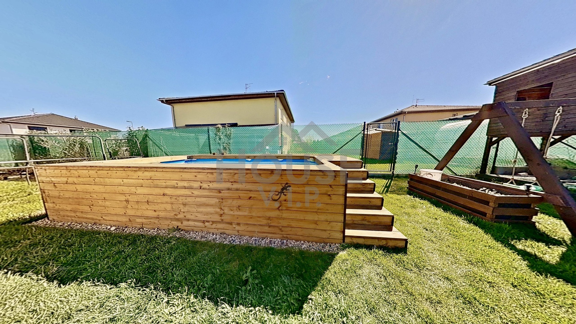 Součástí nemovitosti je soukromá zahrada o velikosti 260 m² s bazénem, terasou s pergolou (20 m²) a zahradním domkem (15 m²) vhodným na nářadí či kola.