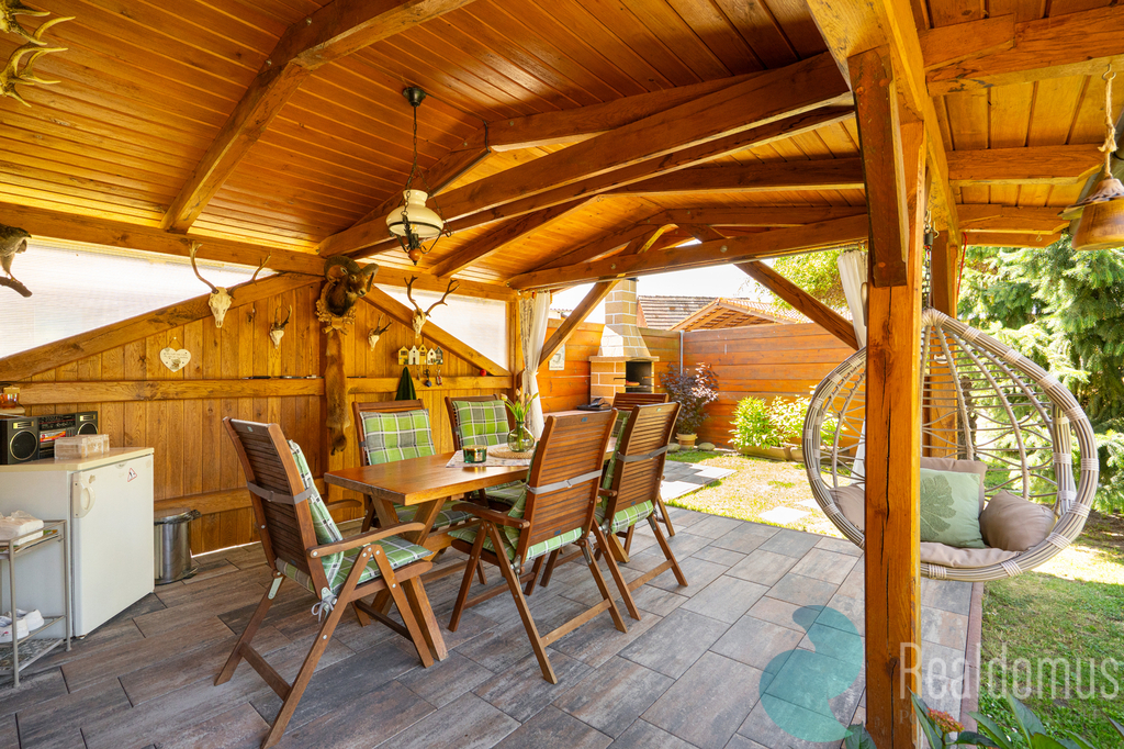 Venkovní posezení s krbem, 2 x přístřešek na vozidla, 2 x studna, příjezdová brána do objektu na el. ovládání.