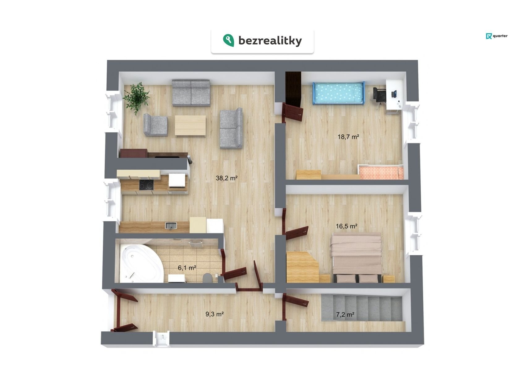 První podlaží: obývací pokoj s jídelnou a kuchyní (38,2 m2), dětský pokoj (18,7 m2), ložnice (16,5 m2), koupelna s toaletou (6,1 m2)