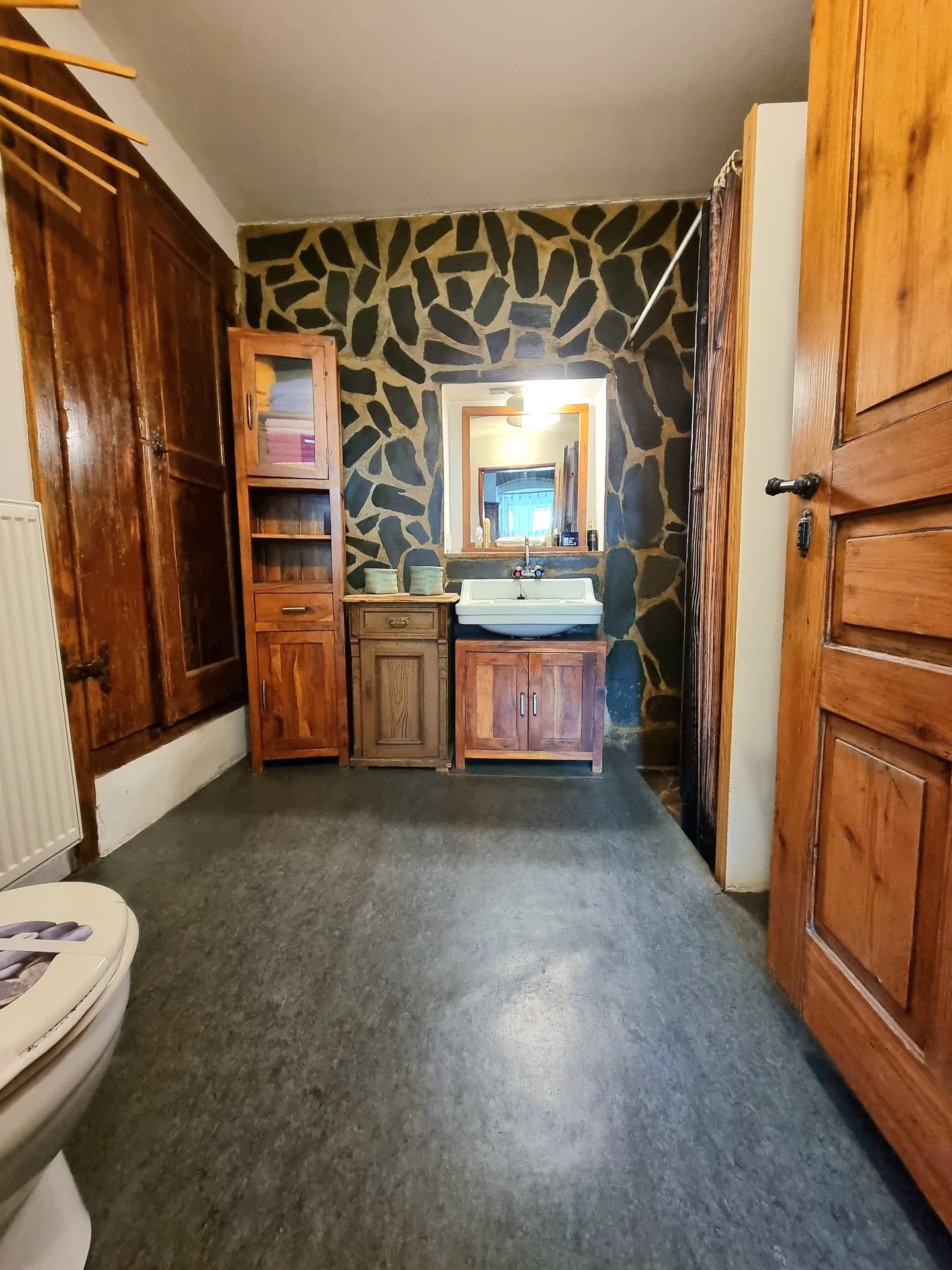 Koupelna byla zrekonstruována se vkusem a nabízí sprchový kout, toaletu a místo na pračku. Jsou zde instalovány dva elektrické bojlery, přičemž jeden je napojen na krbová kamna pro úsporu energie a druhý na standardní elektřinu.