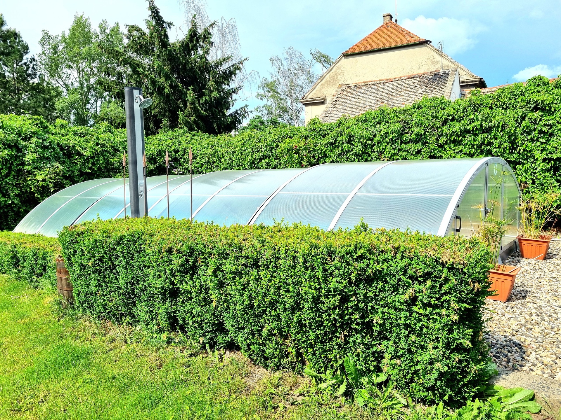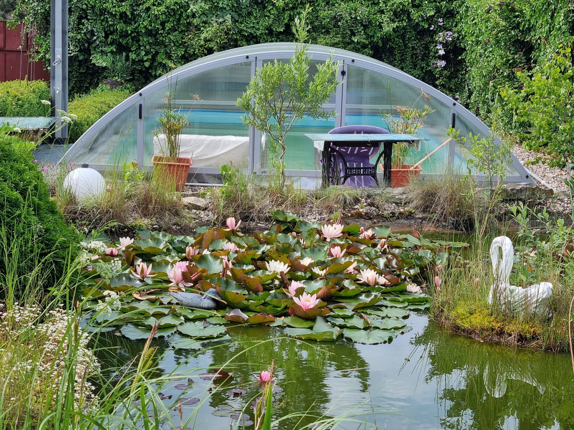 Na udržované zahradě se nachází krytý bazén s filtrací, velké jezírko plné ryb a leknínů a stodola, která je přeměněna na dílnu pro muže. Odpady jsou svedeny do septiku .