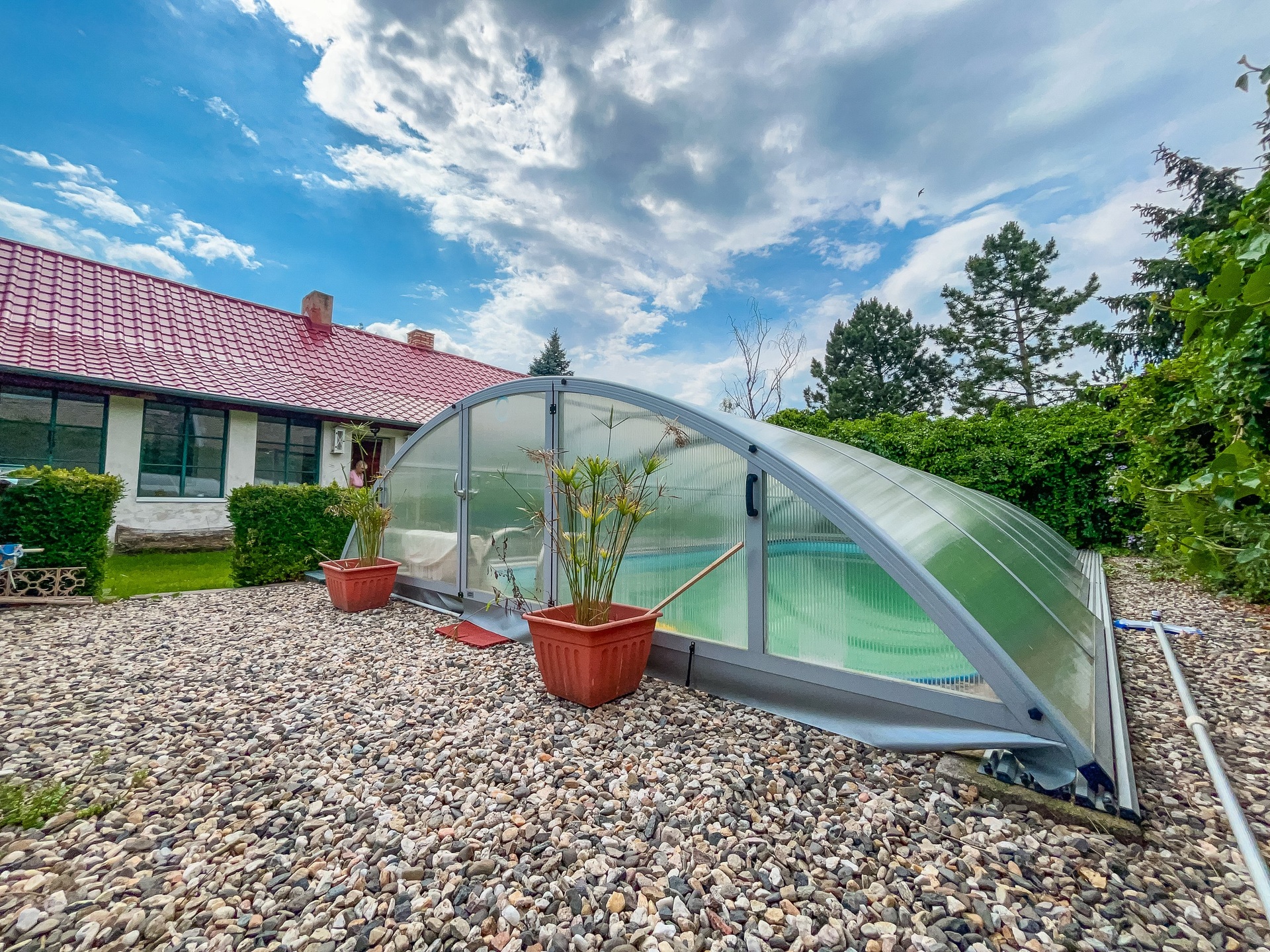 Zasklená terasa s funkční letní kuchyní a toaletou vám umožní trávit příjemné chvíle venku.