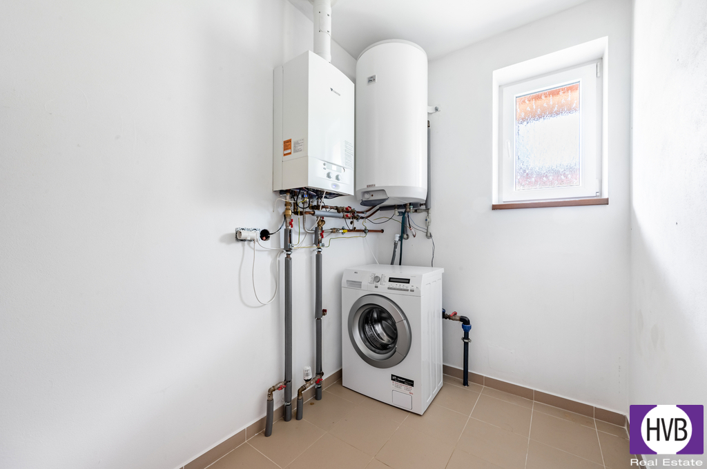 Vytápění bungalovu zajišťuje kondenzační kotel, velkou výhodou je možné využití krbových kamen s rozvodem do topných těles. Do domu je přivedena voda z obecního řádu, ohřev řešen elektrickým bojlerem.