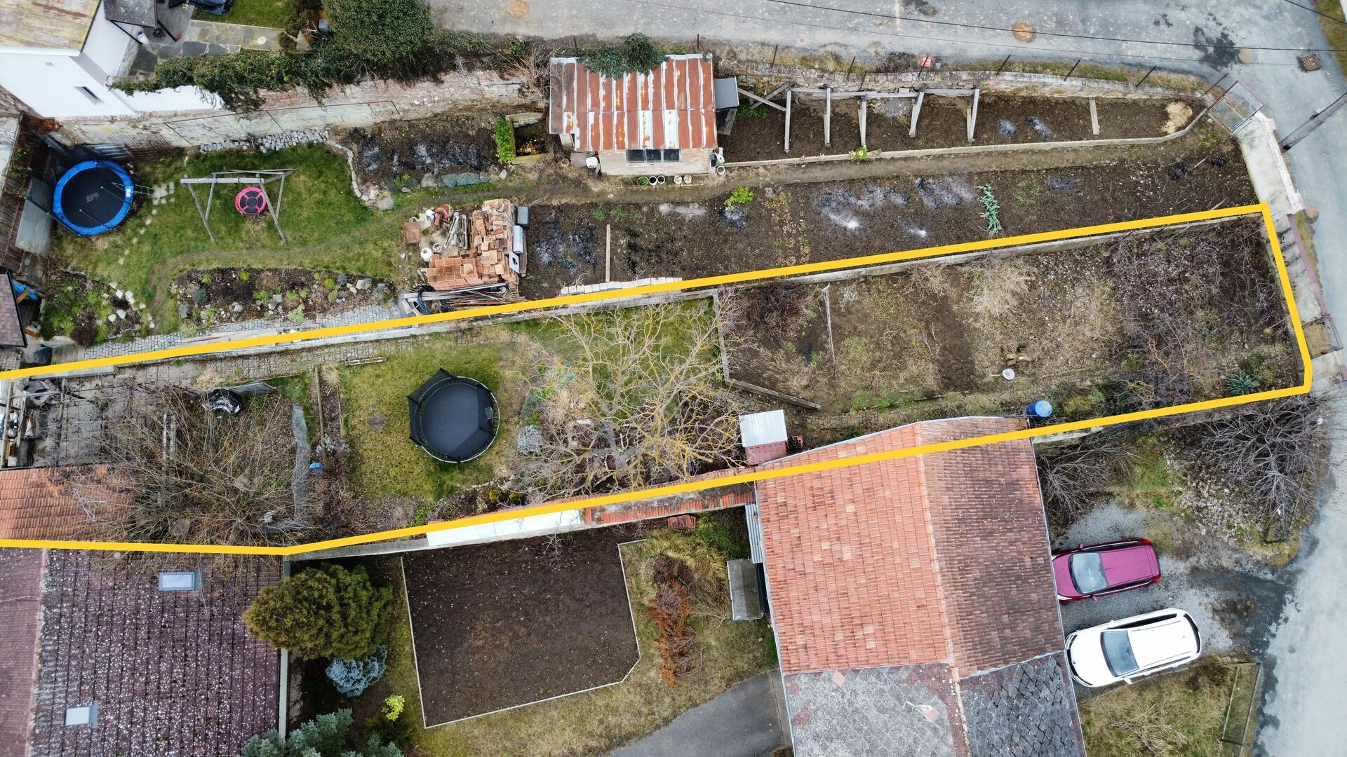 Zahrada se nachází v těsné blízkosti domu a je přístupná přes cestu, která je ve spoluvlastnictví se sousedy.