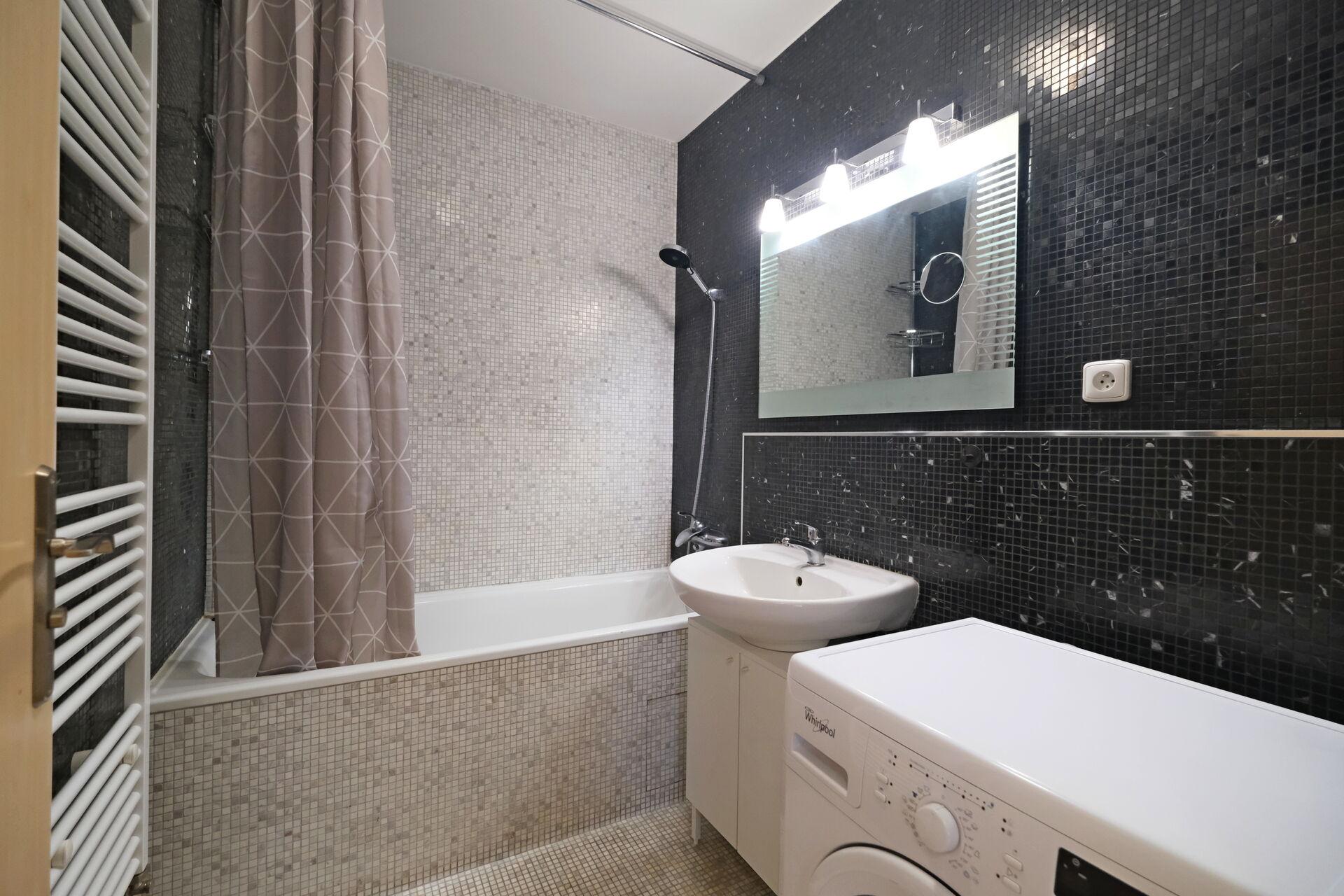 Koupelna s vanou je vybavena pračkou.