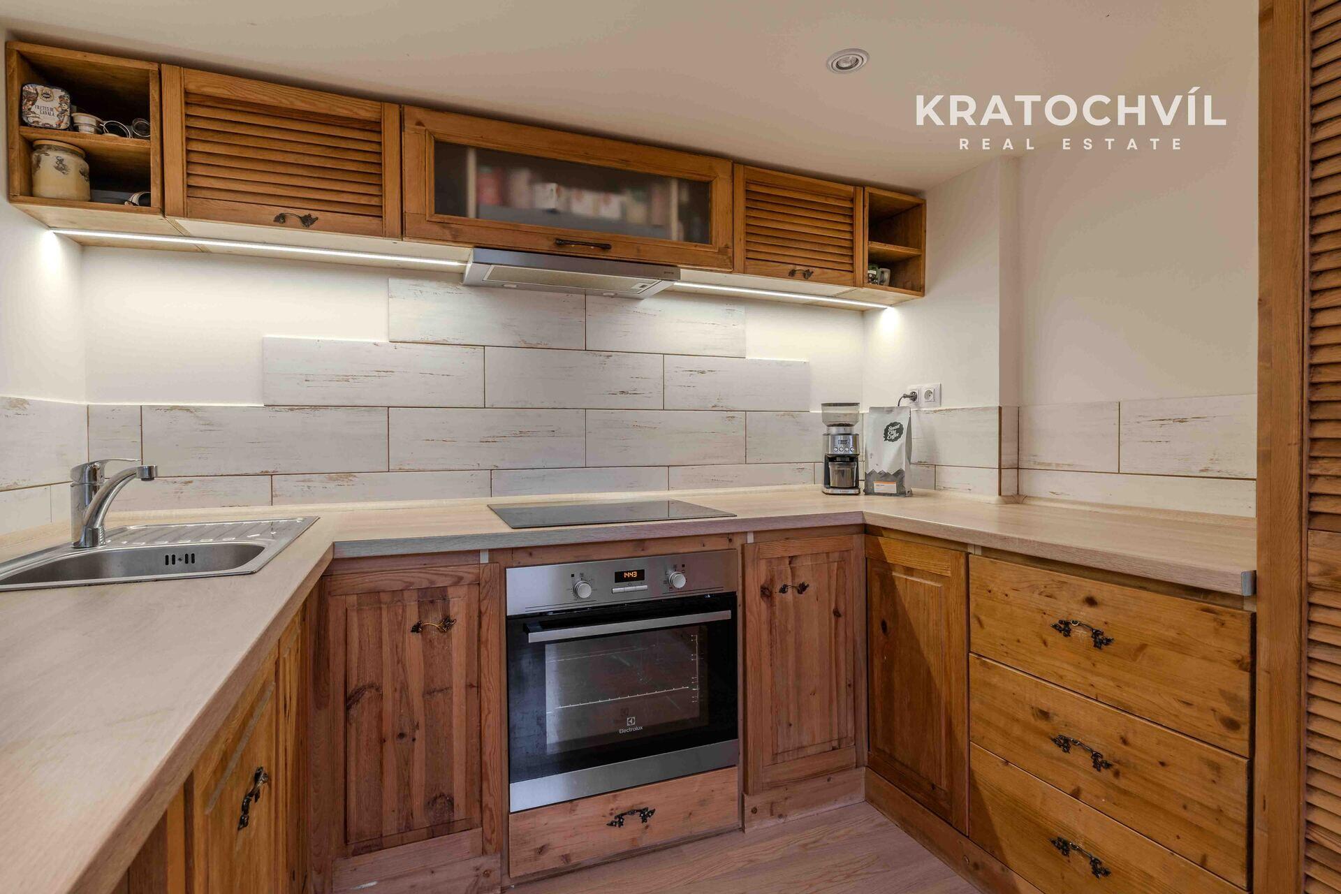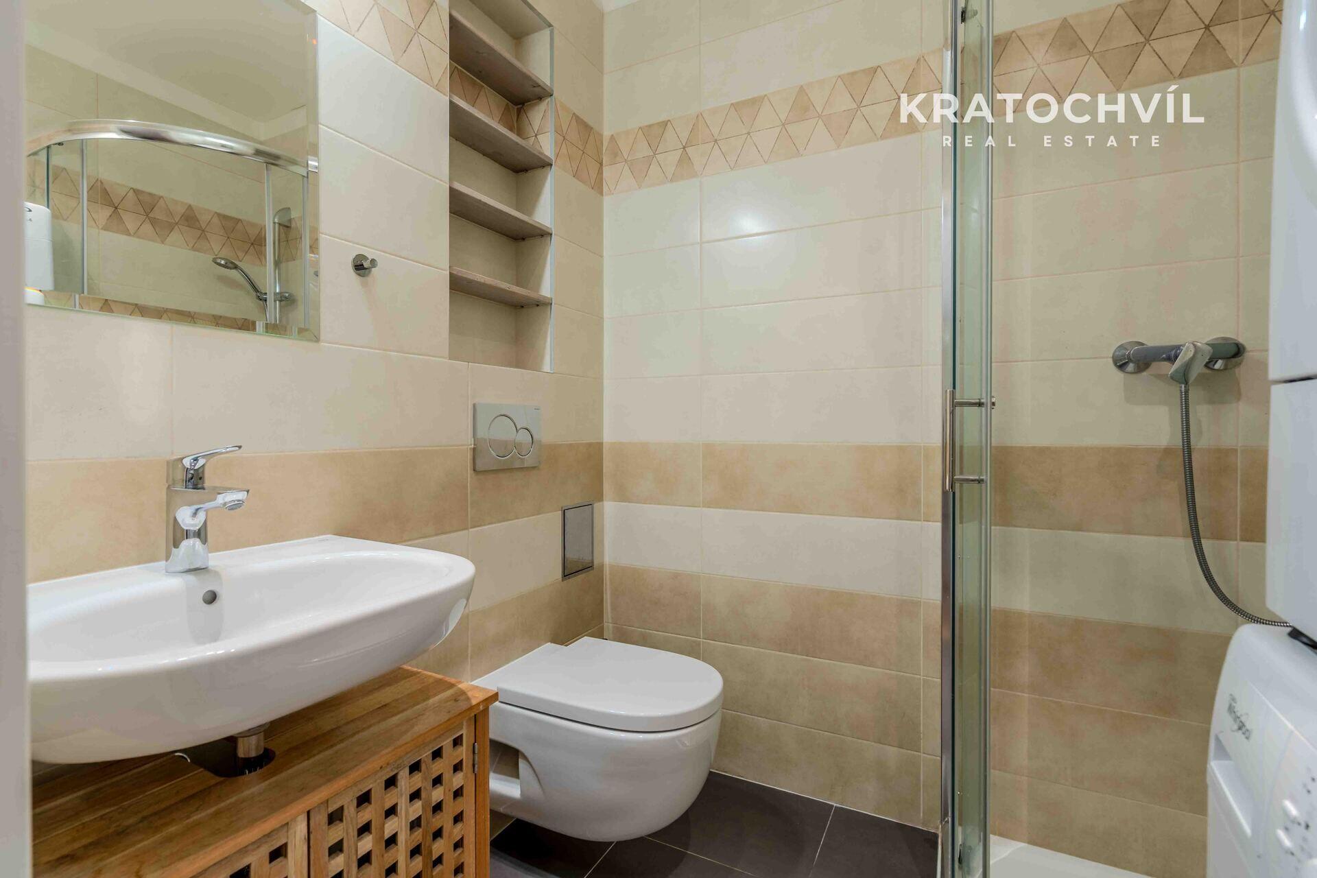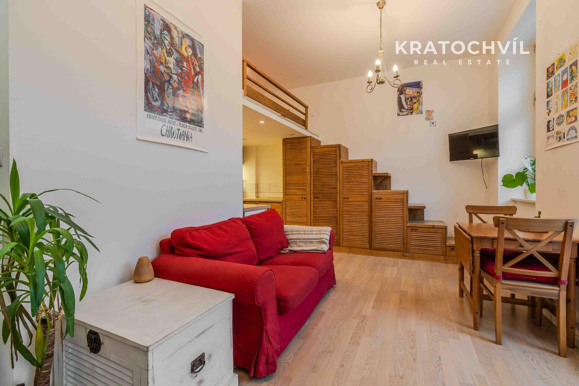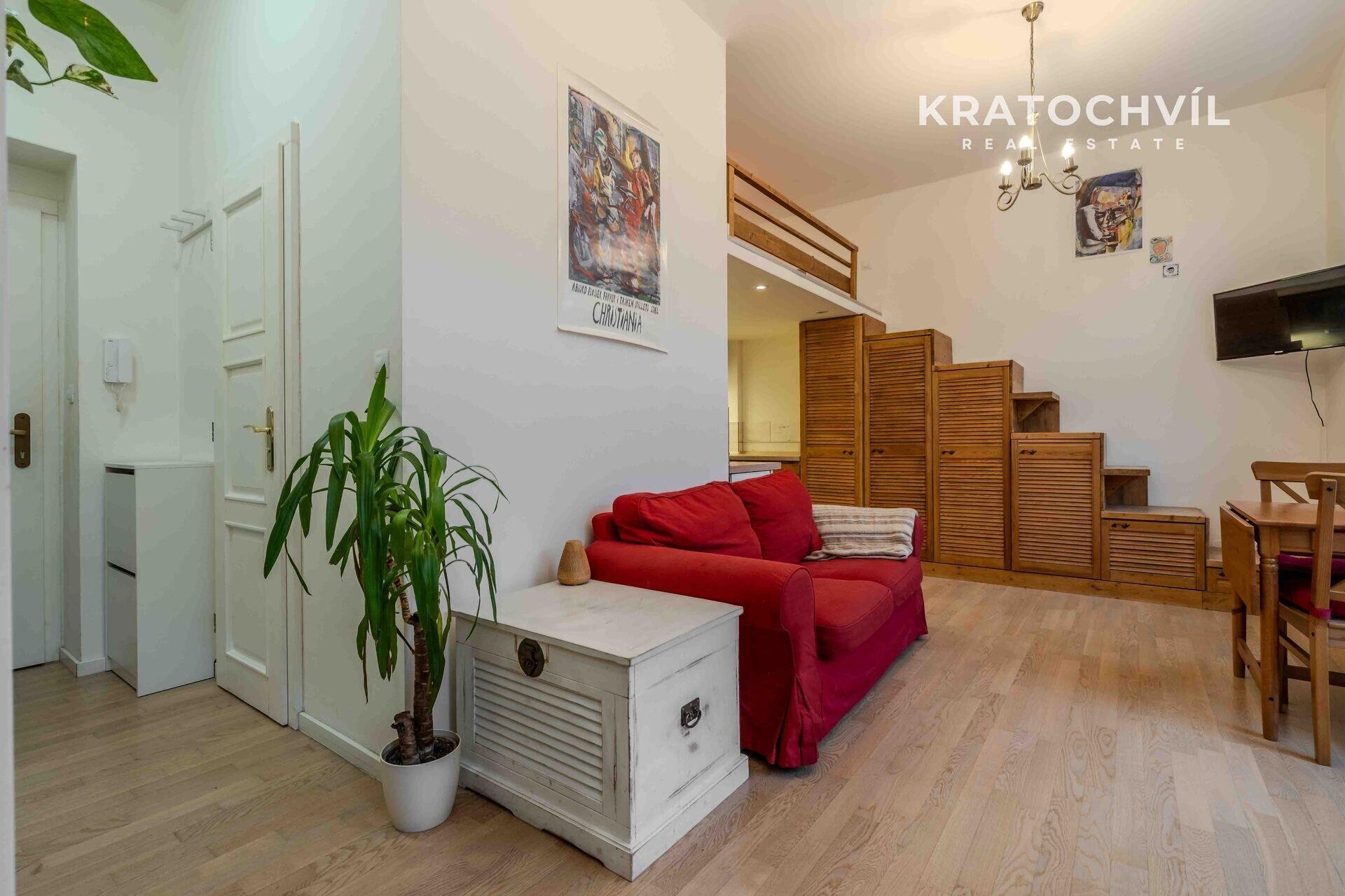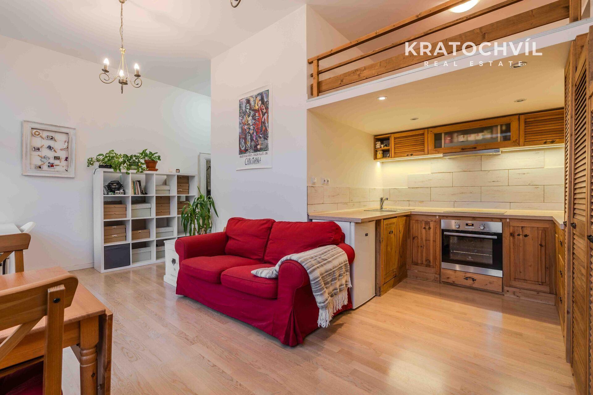 Hlavní výhodou tohoto bytu jsou vyšší stropy a vestavěné patro na spaní, což zvětší plochu bytu. V koupelně je sprchový kout, místo pro pračku se sušičkou, na podlaze jsou plovoucí podlahy a dlažba.