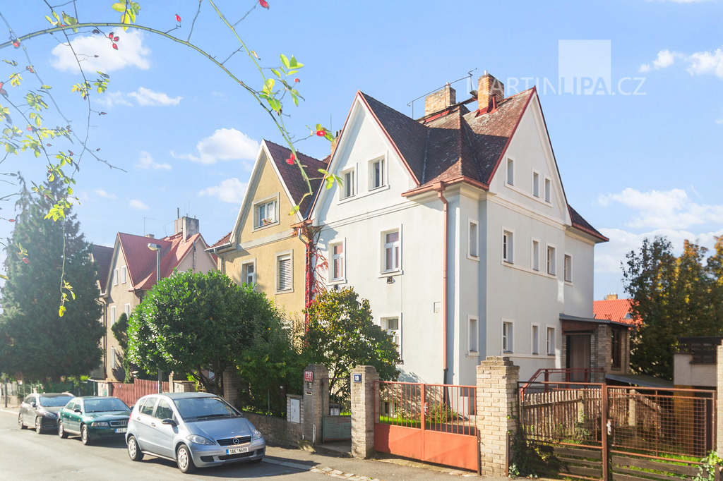 Strašnice. Klidná vilová čtvrť, pár kroků od centra Prahy a přesto úplně jiný svět. Ve Vykáňské ulici stojí dům se třemi bytovými jednotkami a v jeho nejvyšším, tedy druhém patře se právě prodává částečně podkrovní byt o dispozici 2+1 a velikosti 58,4 m².