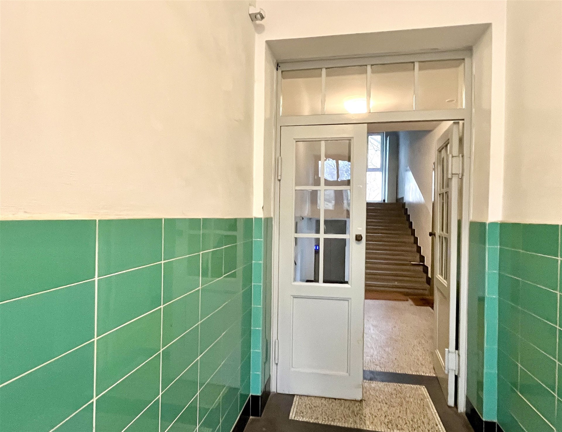 Původní vstupní dvoukřídlé dveře zachovány a dotváří tak spolu s dalšími prvky charakteristický znak architektury 30. let.