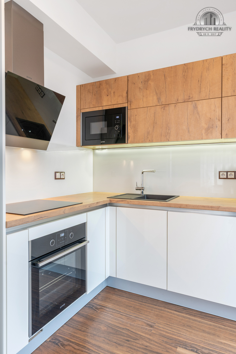 Kuchyně Gorenje s vestavnými spotřebiči (indukce, trouba, mikrovlnka, myčka, lednice s mrazákem, digestoř).