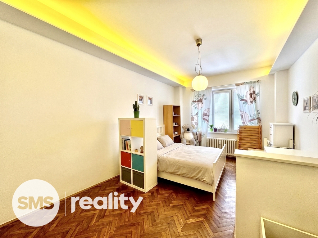 Dispozice je promyšlená: z prostorné vstupní haly jsou samostatně přístupné všechny pokoje – obývací pokoj, ložnice, druhý pokoj i koupelna s vanou a samostatným WC. Žádné průchozí místnosti. Ložnice je orientovaná na sever do vnitrobloku. Obývací pokoj a druhý pokoj jsou orientovány na jih do ulice, takže odpoledního světla je tu víc než dost.