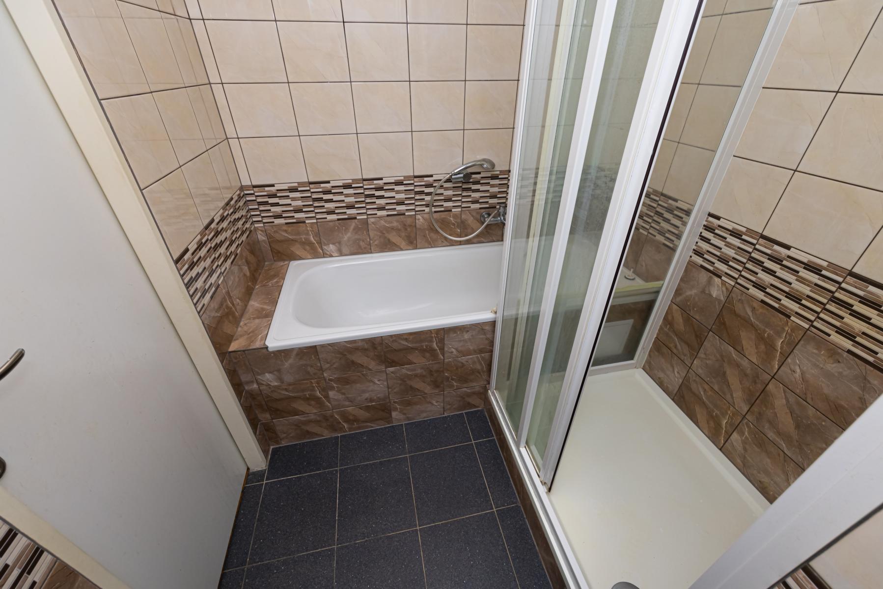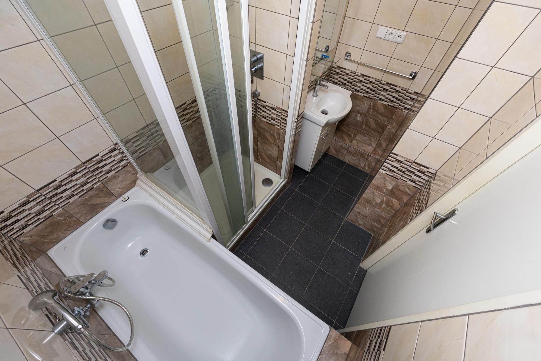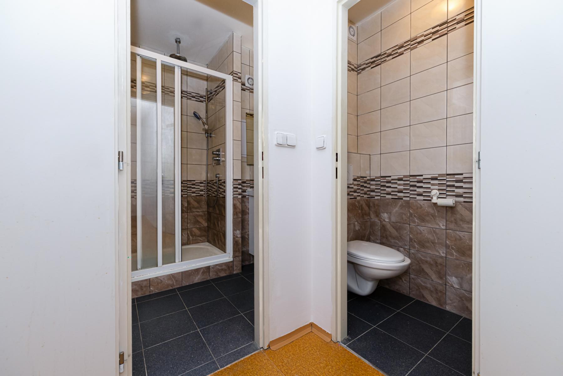 Koupelna disponuje vanou i sprchovým koutem. WC je samostatné. Velkou výhodou je také prostorná šatna a předsíň. K bytu byla navíc přidána i část chodby, což byt činí velmi prostorným a praktickým.