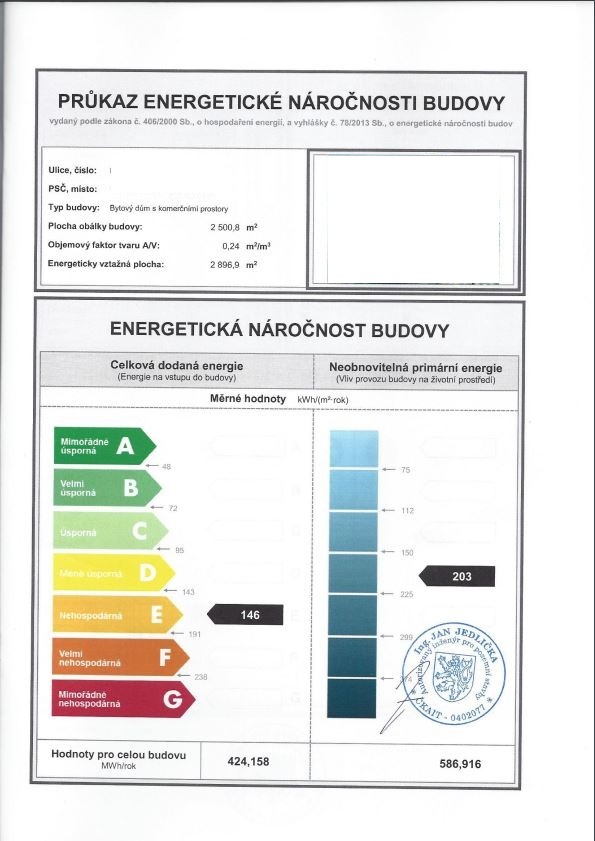Ukazatel energetické náročnosti budovy:146 kWh/m²