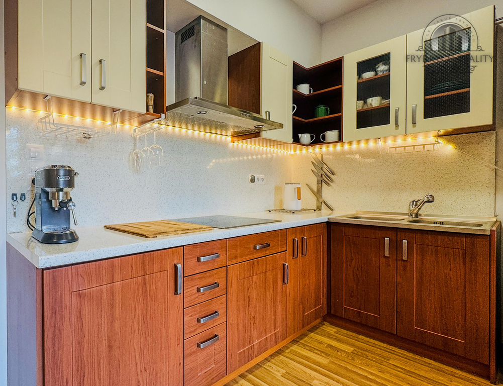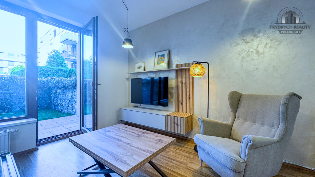 Byt je plně zařízený a vybavený nábytkem, sedací soupravou, postelí, stolem, křeslem, televizní stěnou a kuchyňskou linkou.