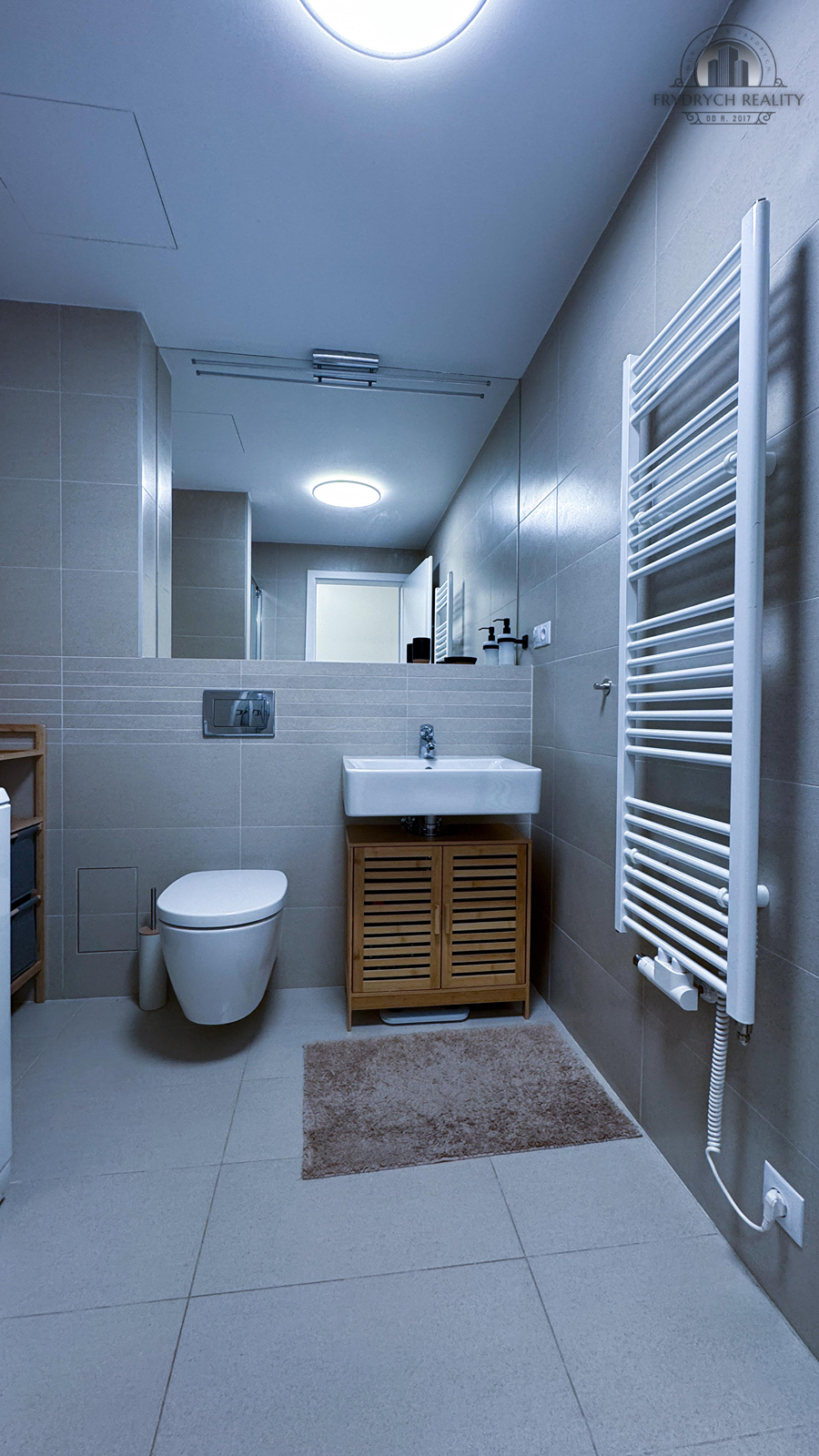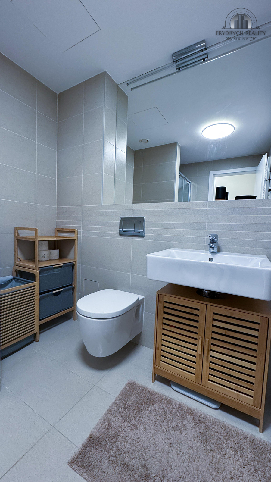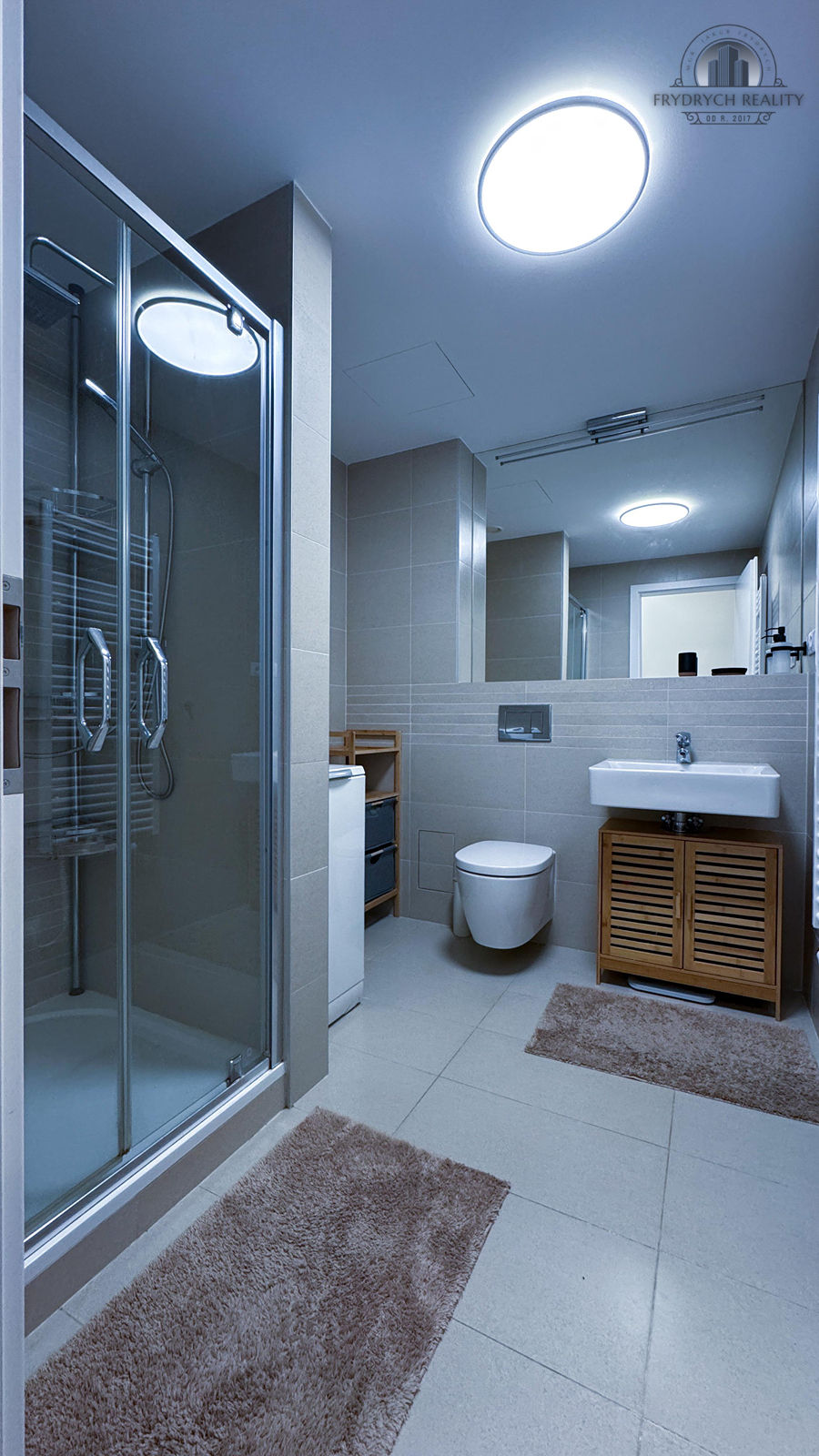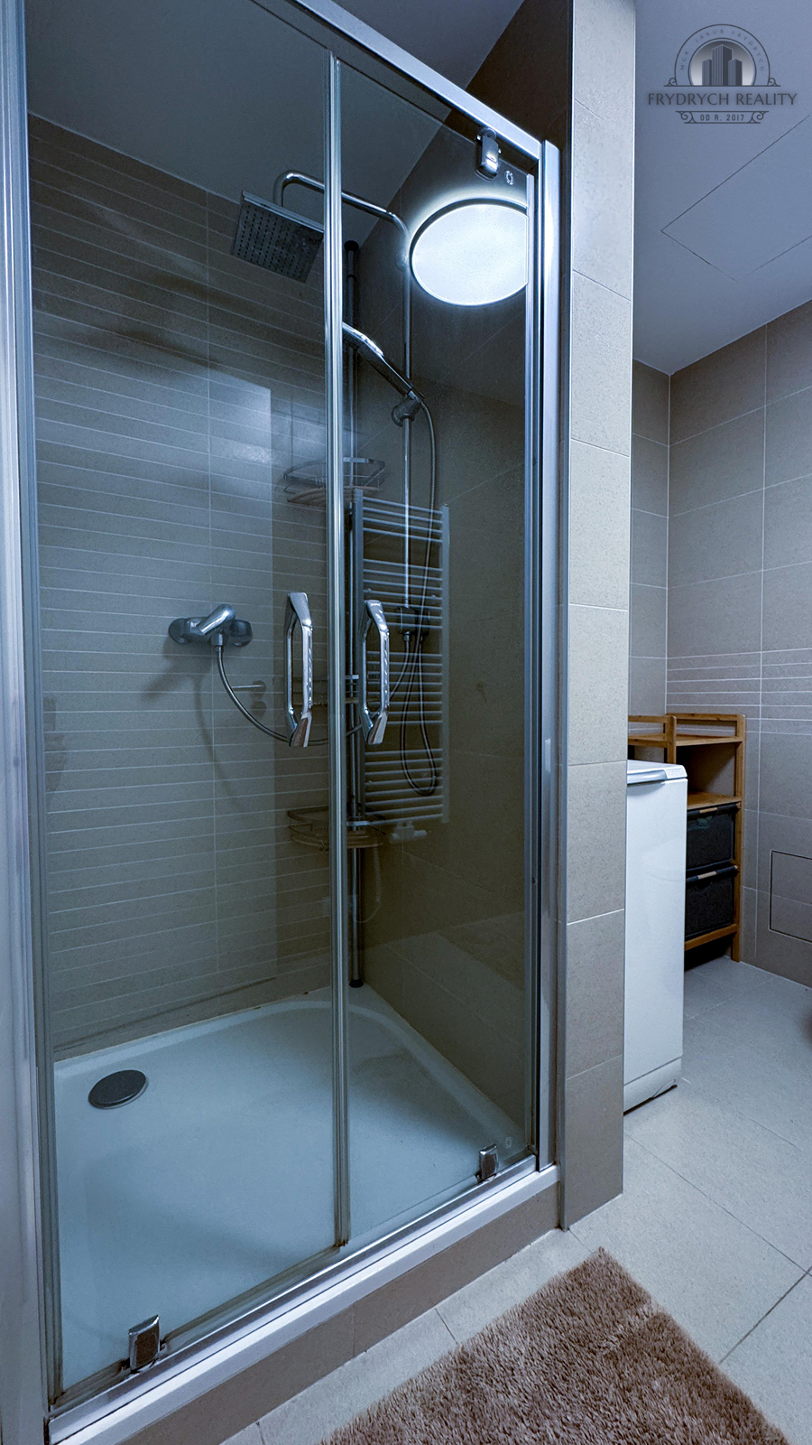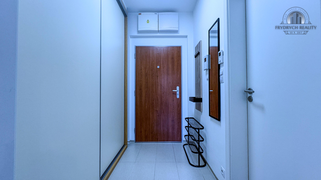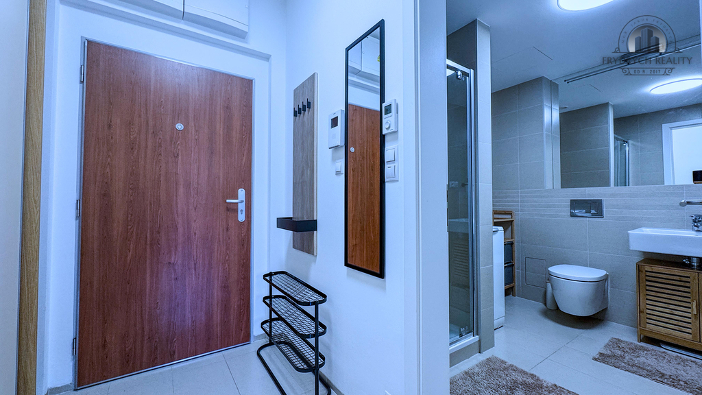 V koupelně je toaleta a sprchový kout, ve vstupní chodbě je velká vestavná skříň.