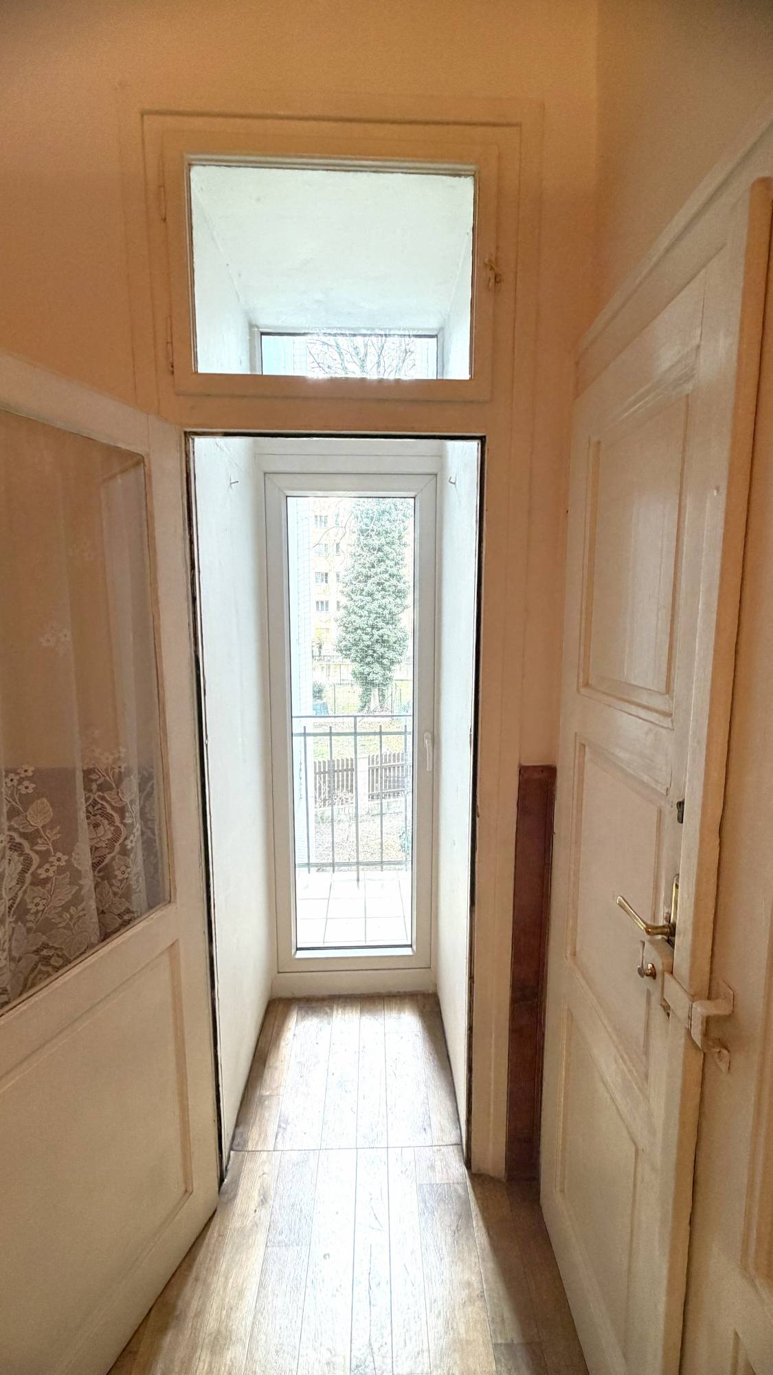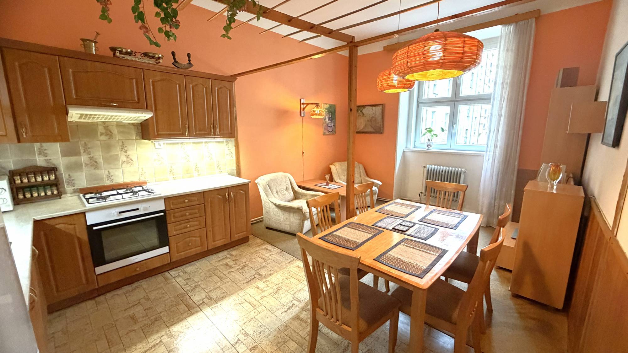 Dispozice bytu nabízí tři obytné místnosti, jednu s kuchyňským koutem, velkorysou vstupní halu, koupelnu se sprchovým koutem, samostatné WC, technickou místnost a spíž, vč. balkonu. Okna jsou orientována na jih do ulice a na sever do světlého vnitrobloku.