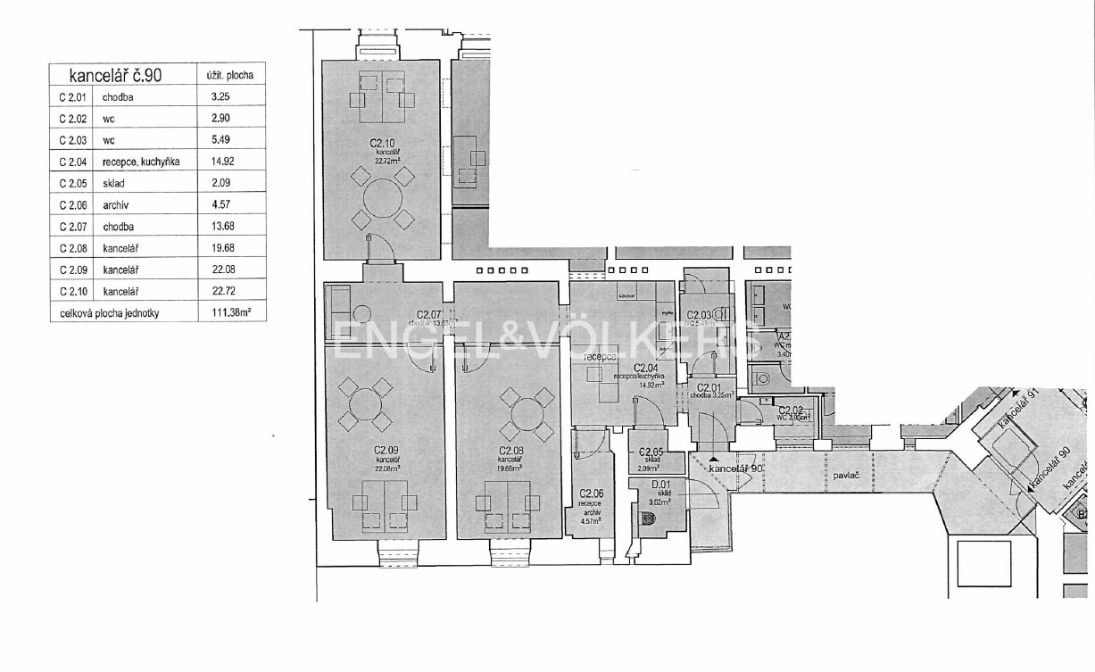 Dispozičně je jednotka řešena jako vstupní chodba, recepce, kuchyňka, zázemí a tři samostatné kanceláře - ideální zázemí pro finanční, účetní, právní či poradenské firmy, případně pro jinou administrativní činnost.
