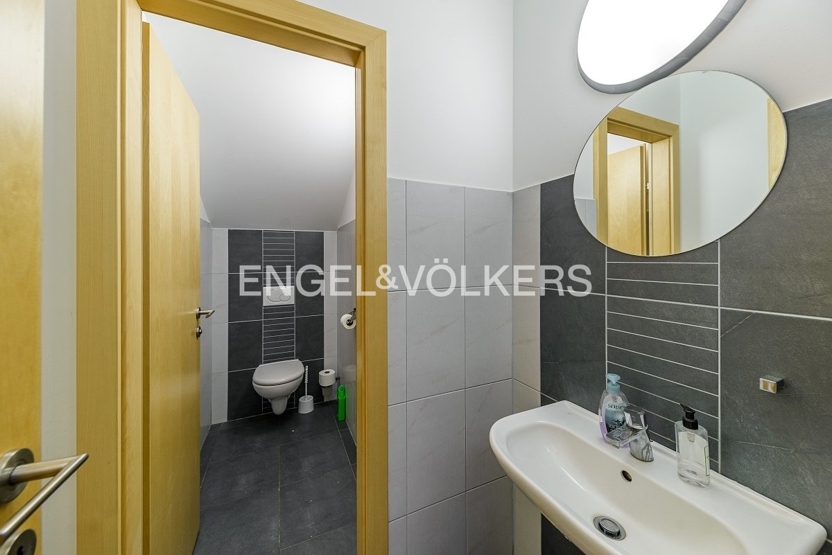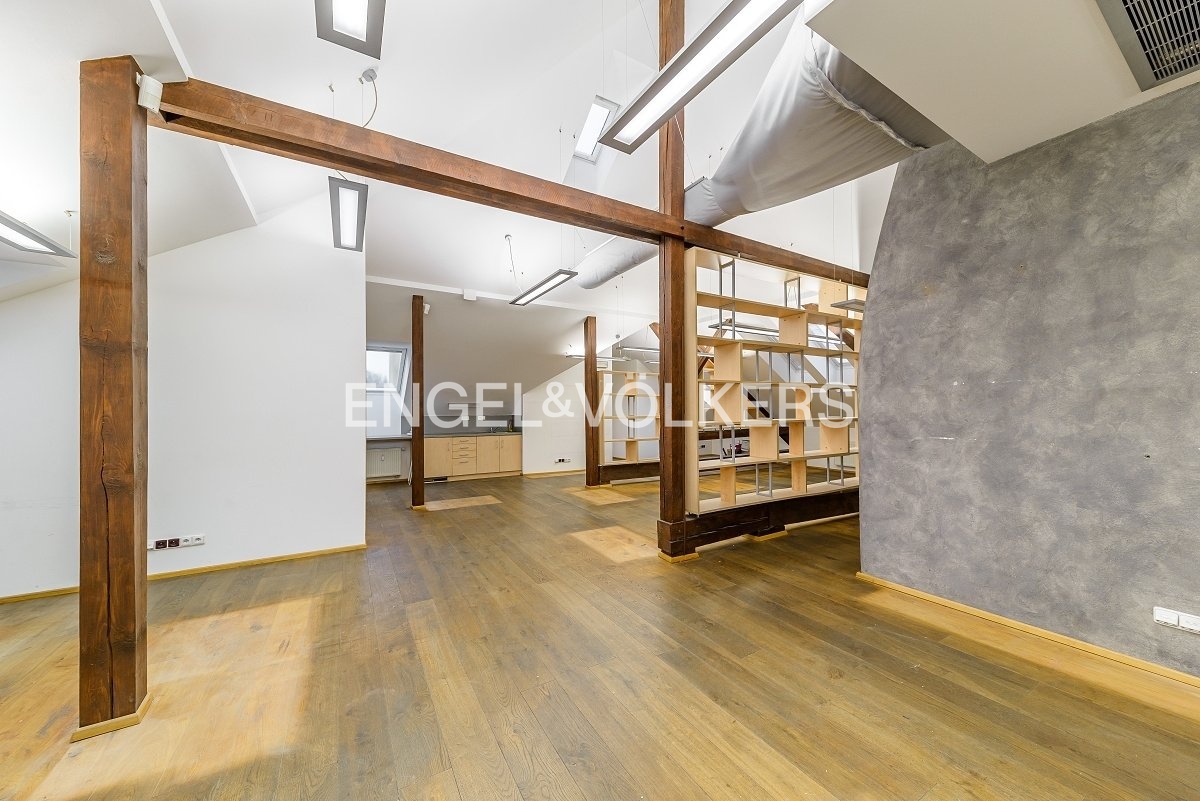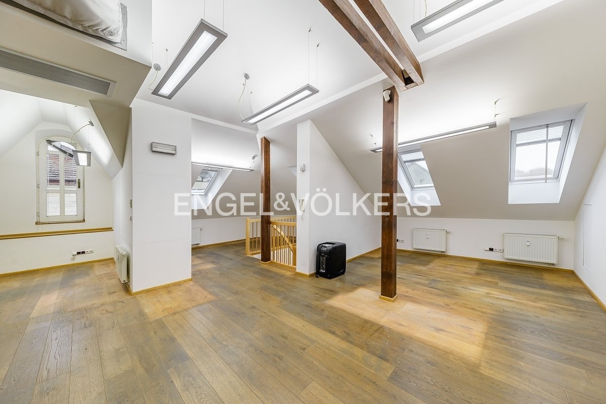 Prostoru dominují dřevěné elementy - parkety, krov střechy do kterého jsou umístěny policové stěny. Prostory mají dostatek světla díky střešním oknům a kancelářskému osvětlení. Z prostor je přístup na terasu, v současnosti přes okno s možností dobudování schodiště. Zavolejte a domluvte si prohlídku.