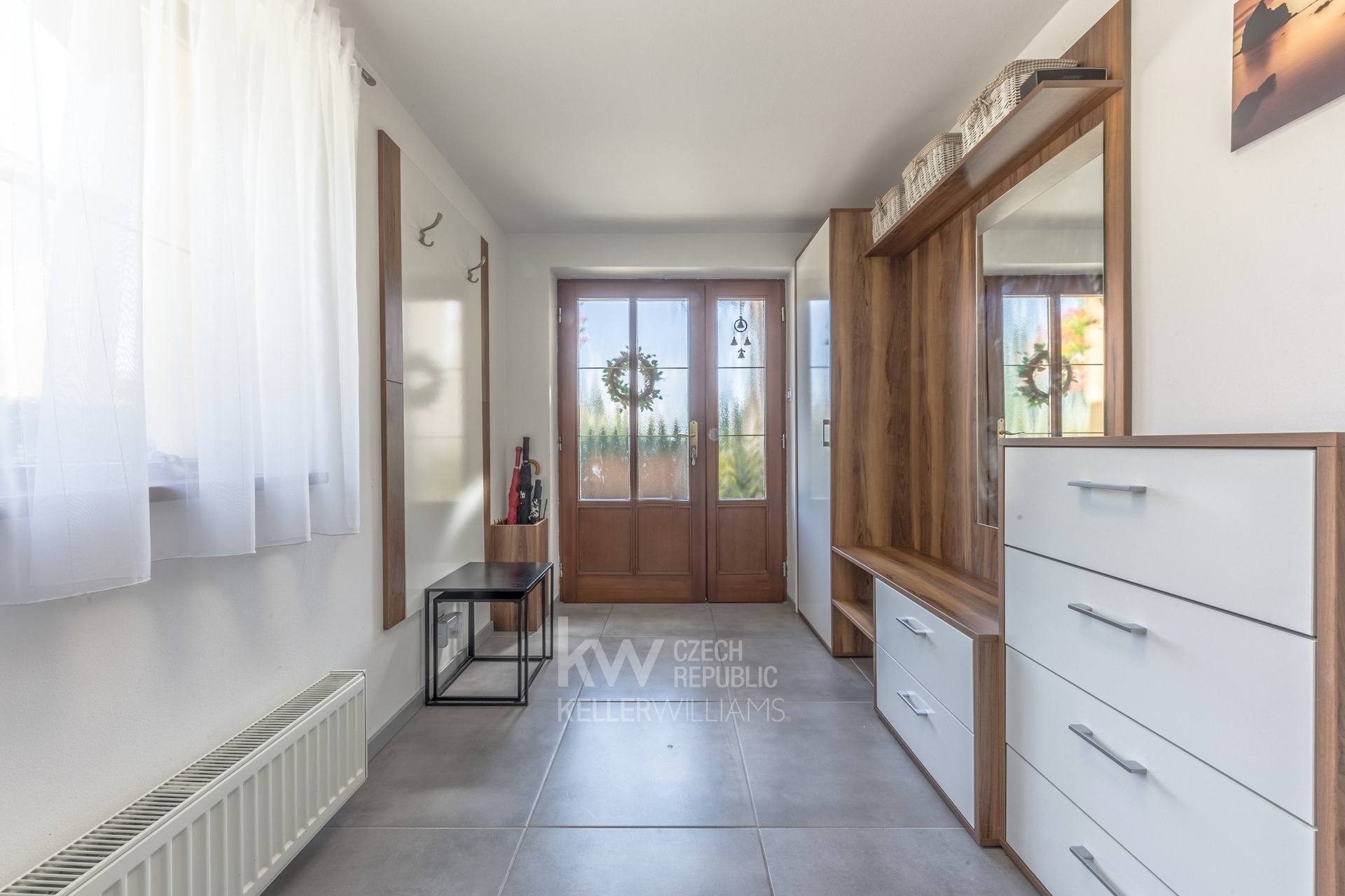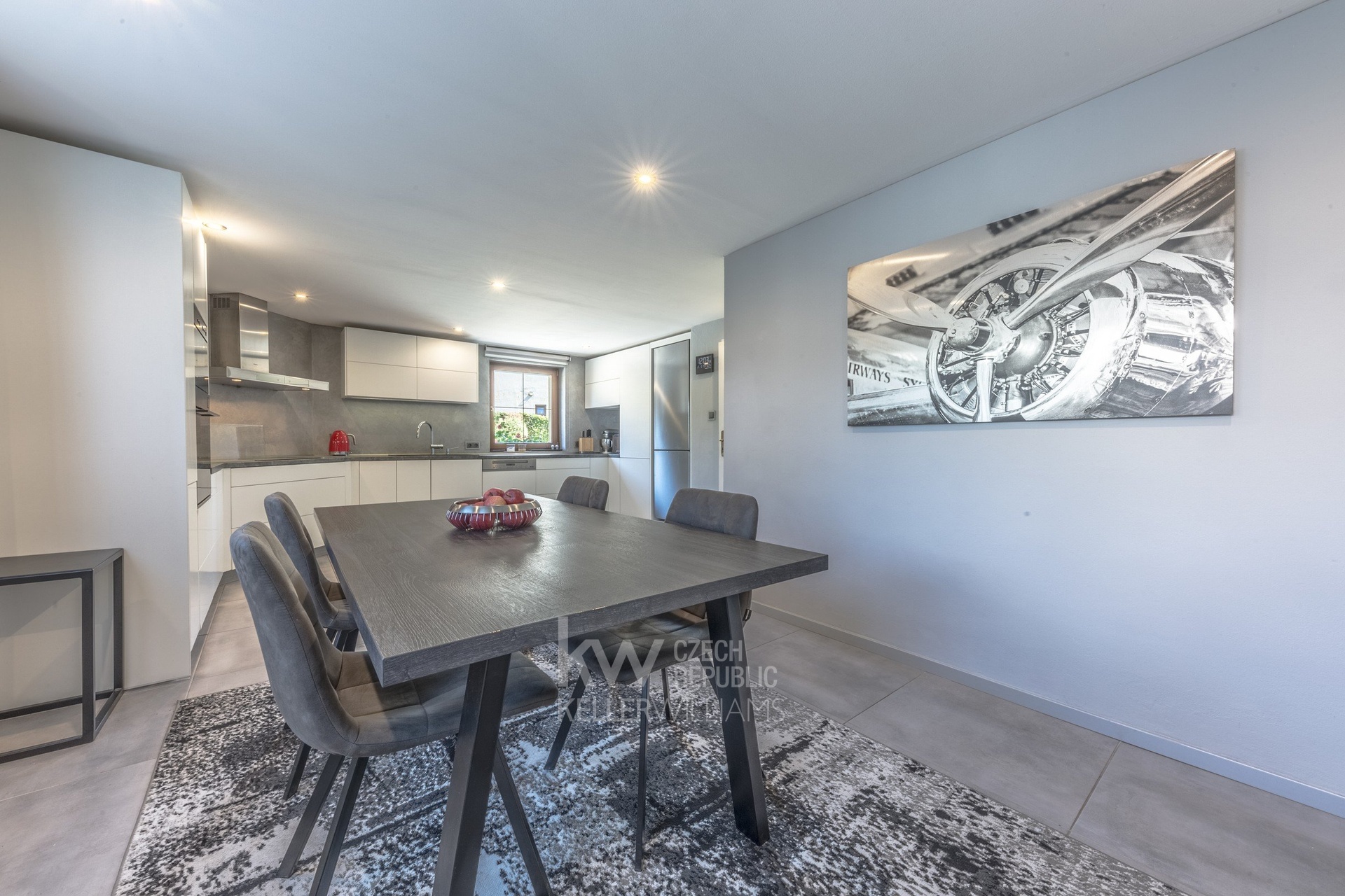 Srdcem domu a rodinné pohody jsou prostorný obývací pokoj a velkoryse řešená jídelna s kuchyní, kterou je možno využít také jako obývací pokoj s kuchyňským koutem. Dále je v přízemí hlavní ložnice, koupelna se sprchovým koutem, samostatná toaleta, šatna, praktická komora a vstupní hala.