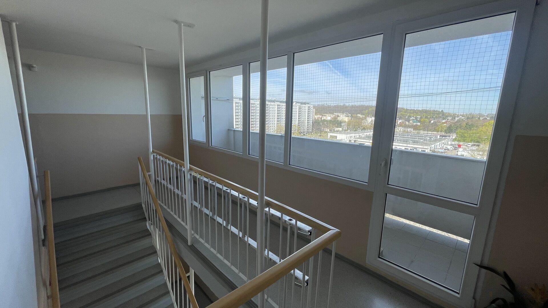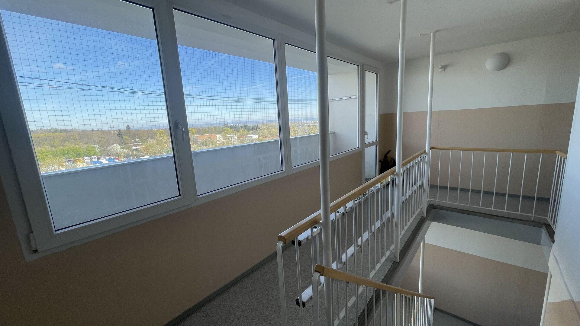 Byt má plastová okna. Stoupačky vody jsou v plastu, odpadu původní, vnitřní rozvody elektřiny původní, elektroměr je vypojen, ale nainstalován. Plyn zaveden pouze pro vaření, ale plynoměr je odebrán. Byt využívá společný velký balkón na patře s možností sušení prádla.