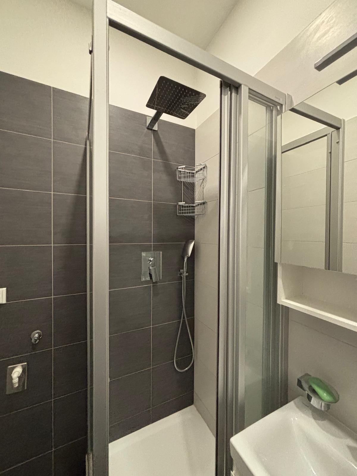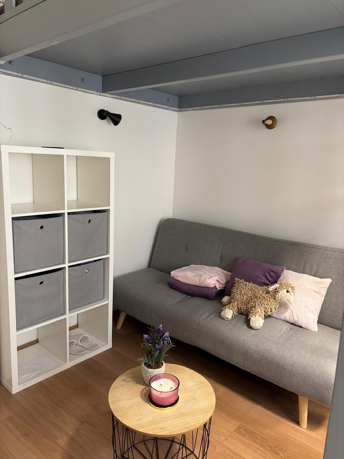 Hlavní obytný prostor je prakticky řešený a vybaven patrem na spaní, přičemž okna směřují do tichého vnitrobloku, což zajišťuje dostatek klidu a soukromí. Kuchyňský kout disponuje varnou deskou, digestoří a mikrovlnnou troubou. Koupelna je moderní, se sprchovým koutem.