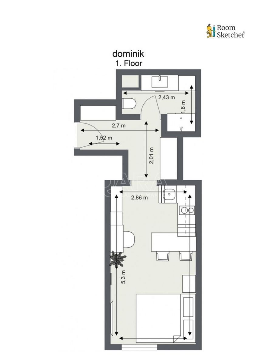 Byt je ve velmi dobrém stavu a má praktické uspořádání menší rohová kuchyň s barovým pultem je propojená s obývacím pokojem. Dále je zde chodba ze které se dostanete do koupelny se sprchovým koutem a WC. Byt je připravený na bydlení či pronájem, bez nutnosti investic. Velkou výhodou je klimatizace, podlahové vytápění v koupelně a vybavení bytu (viz. fotografie) které je součástí prodeje.