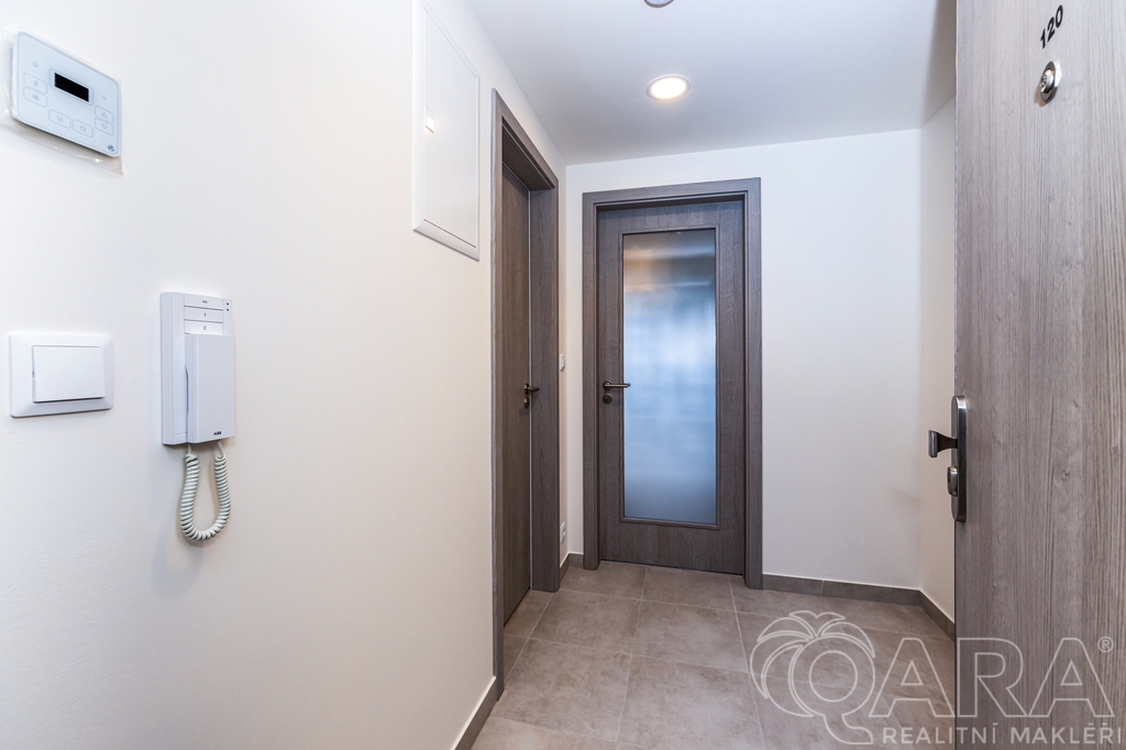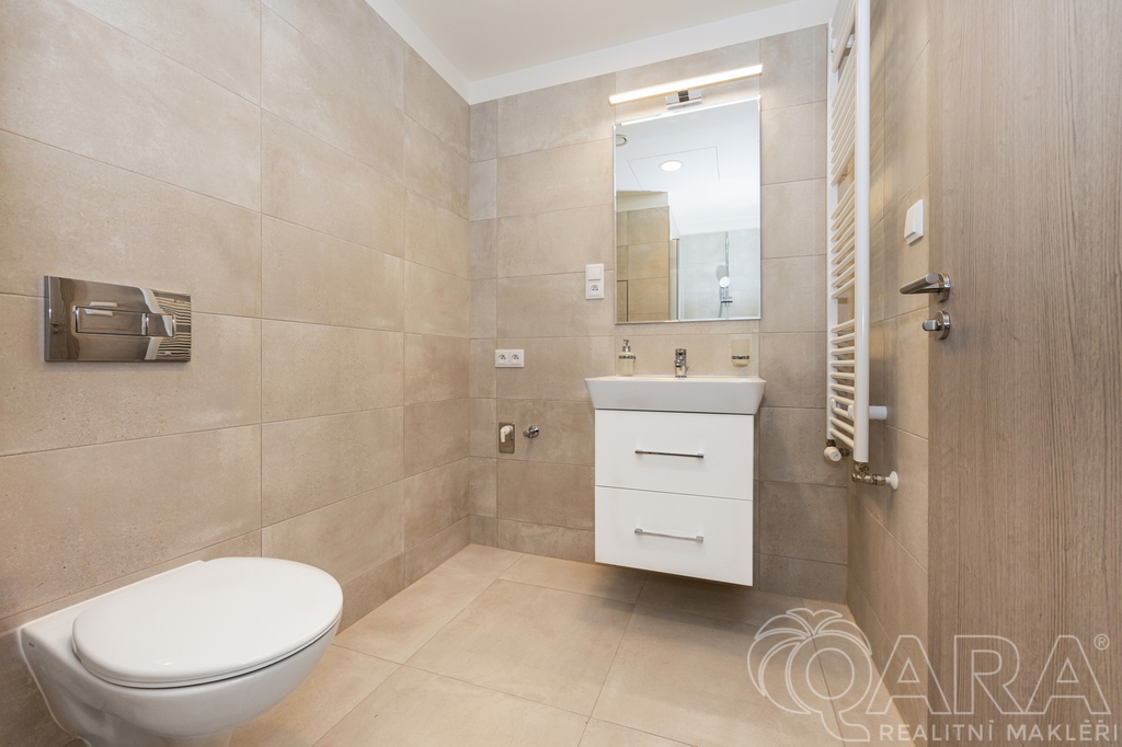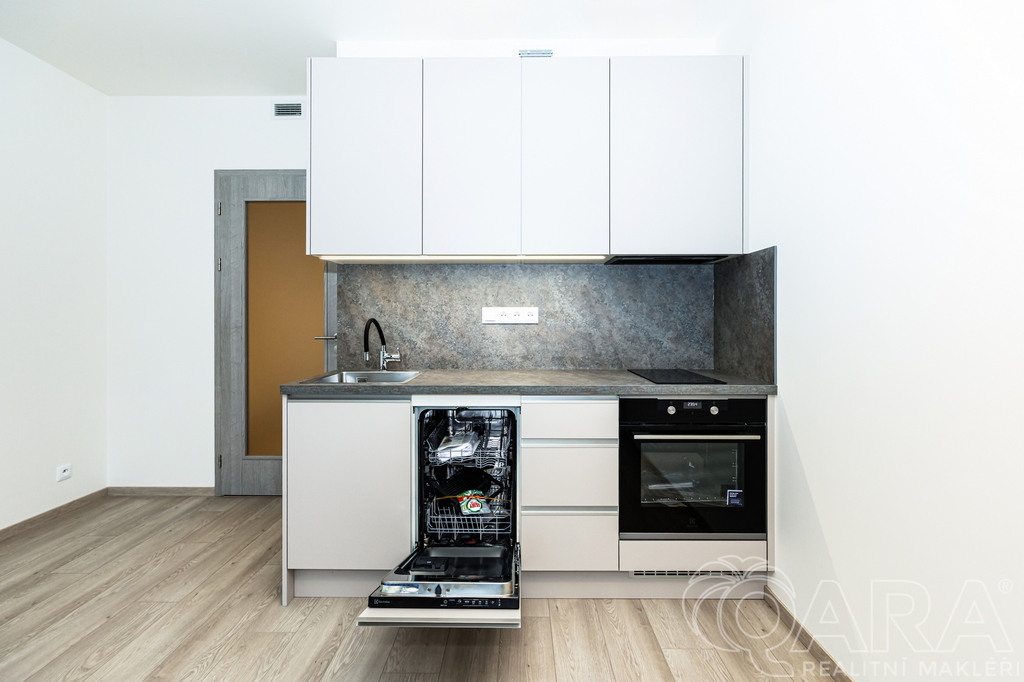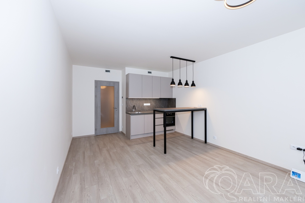 Byt je dispozičně členěn do vstupní chodby se šatní skříní, koupelny s toaletou, sprchovým koutem a pračkou, dále obytné místnosti s kuchyňskou linkou a vstupem do lodžie. Výhled z okna a vlastní lodžie orientovaná mimo rušnou silnici a tramvajovou trať. Součástí bytu je kuchyňská linka s jídelním stolem, robotický vysavač, modem pro připojení k internetu. Byt bude dovybaven velkou vestavnou skříní v předsíni a vestavnou lednicí a skříní v kuchyni. V ceně nájemného bytu je rovněž zahrnuta sklepní kóje v suterénu domu a kryté parkovací stání. Velmi nízké náklady (energetická náročnost B). Byt je vybaven rekuperací.
