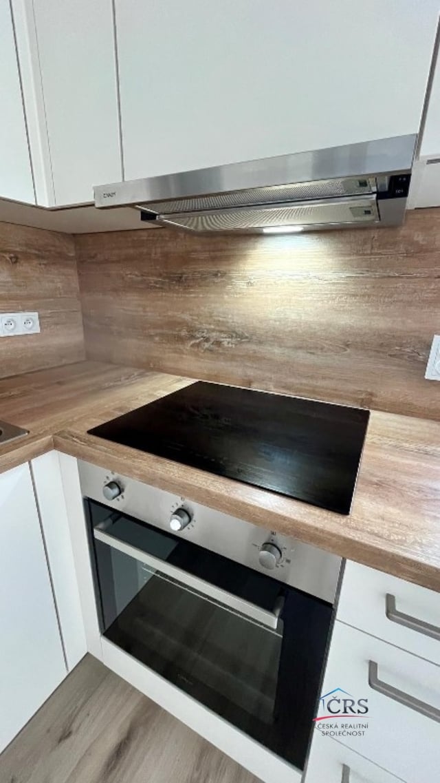 Nová kuchyňská linka se sklokeramickou deskou, elektrickou troubou, mikrovlnou troubou,myčkou, lednicí a digestoří. Bezpečnostní vchdodové dveře.