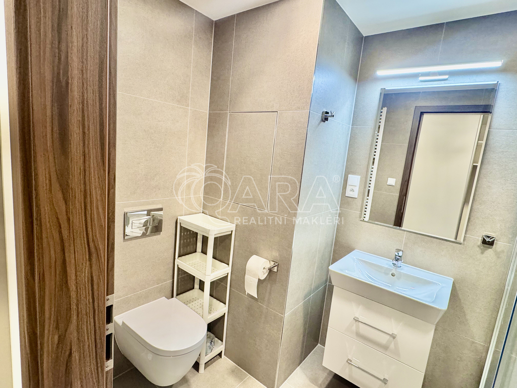 Dispozici bytu tvoří vstupní chodba s vestavěnou skříní, hlavní obytná místnost s kuchyňským koutem, dále koupelna se sprchovým koutem a toaletou. Kuchyňská linka je plně vybavena spotřebiči – k dispozici je myčka, mikrovlnná trouba, trouba, elektrická varná deska a digestoř. Velká lednice s mrazákem. V koupelně je pračka se sušičkou. Byt je vybaven rekuperační jednotkou, která pomaha šetřit na vytapení bytu.