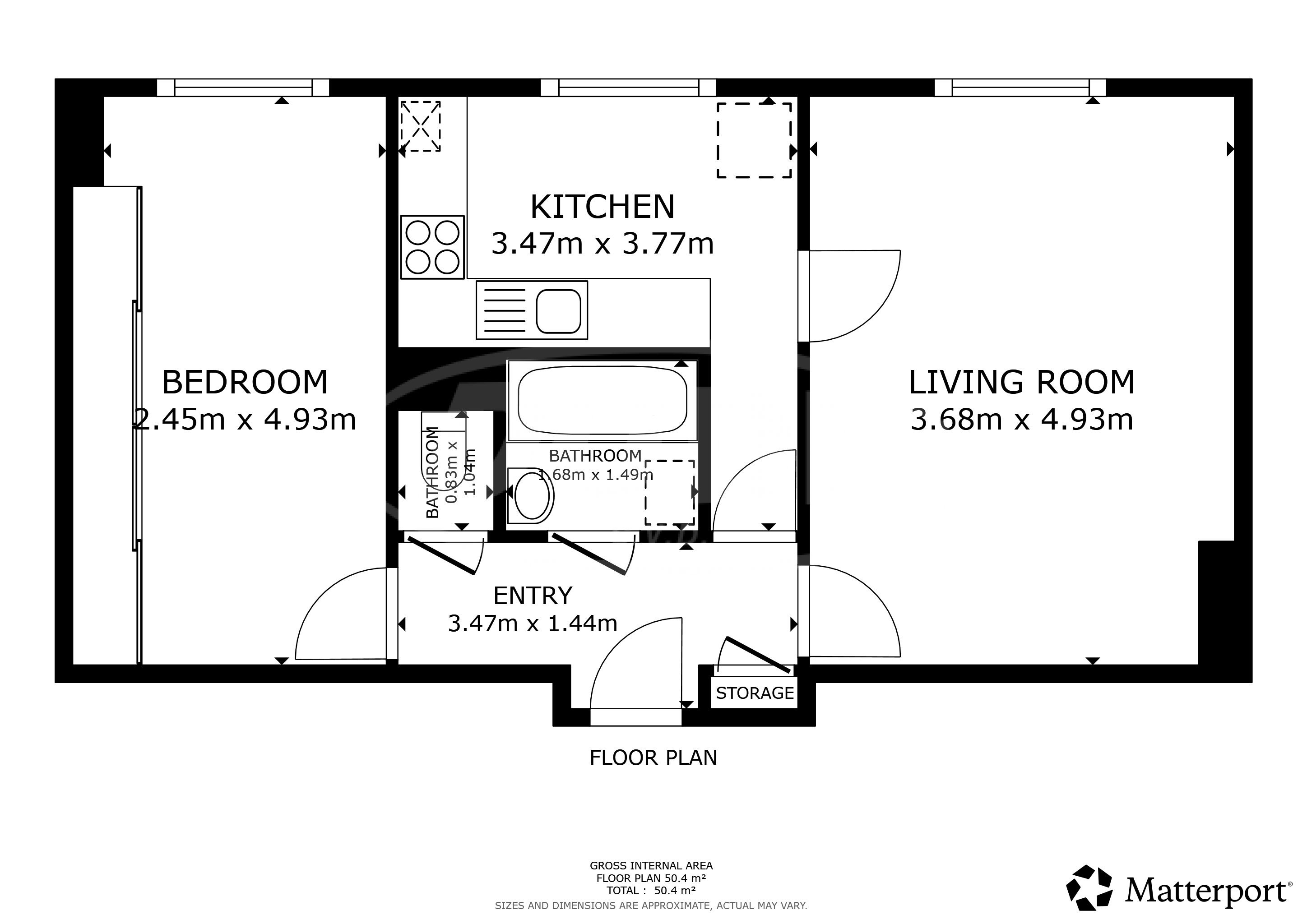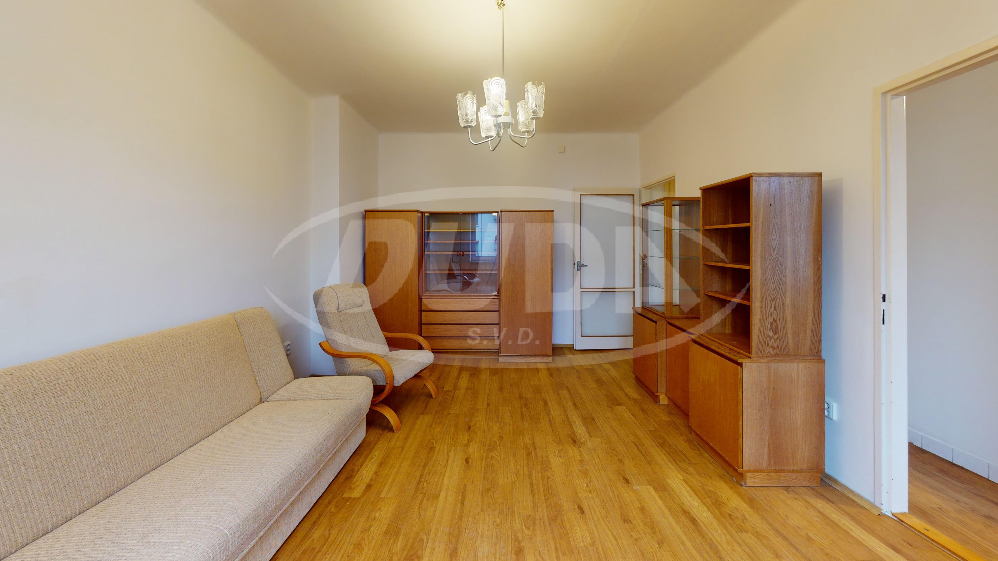 Za vstupními dveřmi bytu se nachází centrální chodbička, ze které je možné vstoupit samostatně do všech místností. Největší a centrální místností je obývací pokoj se samostatným vstupem do kuchyně vybavené kuchyňskou linkou se spotřebiči. Dále se v bytě nachází ložnice, koupelna s vanou a umyvadlem + oddělené WC.