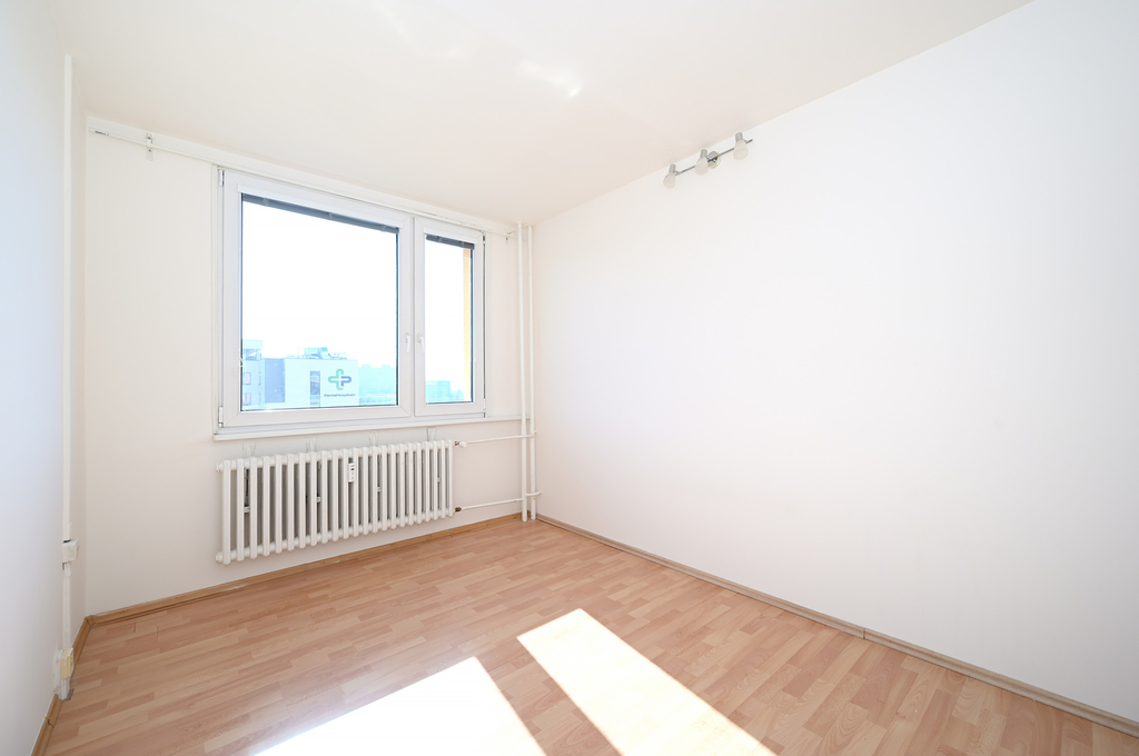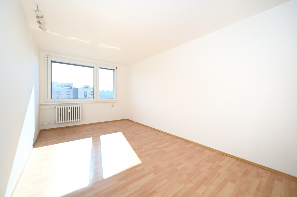 Pro panelové byty je typické praktické využití prostoru a ani tento není výjimkou. Obývací pokoj má téměř 20 m² a kromě sedací soupravy se sem pohodlně vejde i jídelní stůl se židlemi, a to díky chytře řešenému kuchyňskému koutu, který je umístěn ve výklenku obývací části. Z obývacího pokoje se dostanete do ložnice, kam pohodlně umístíte šatní skříň i menší pracovní stůl. V předsíni je velká vestavná skříň a další úložný prostor nabízí komora.