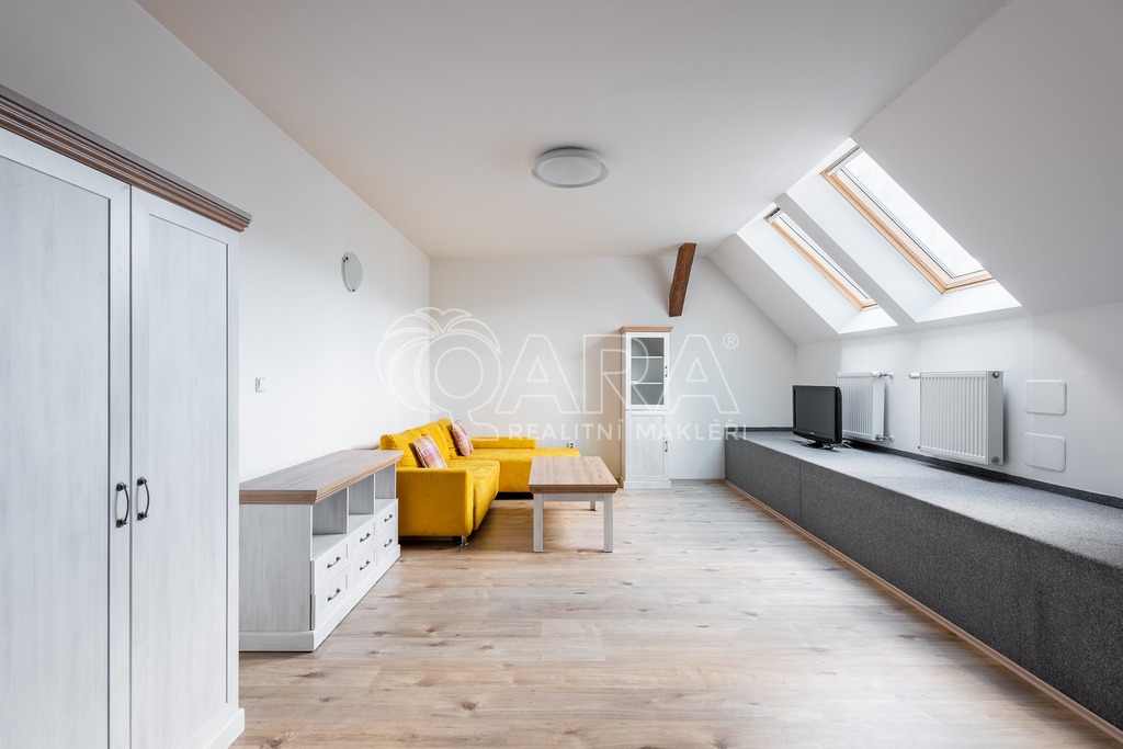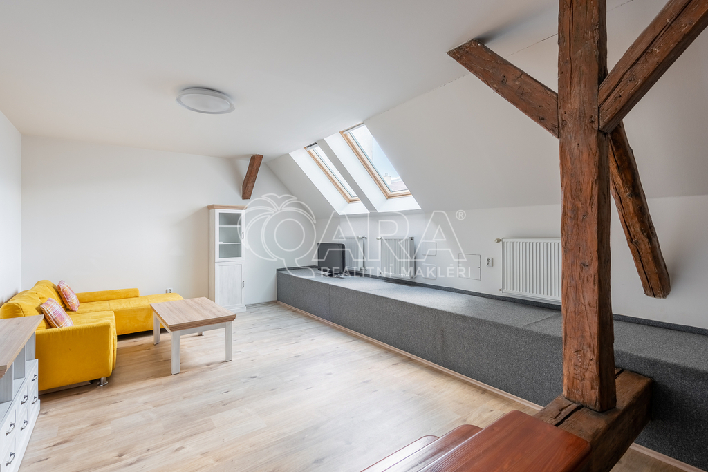 Dispozice: mezonetový byt, 1 samostatná otevřená ložnice, obývací pokoj s kuchyňským koutem, koupelna s vanou, toaleta zvlášť