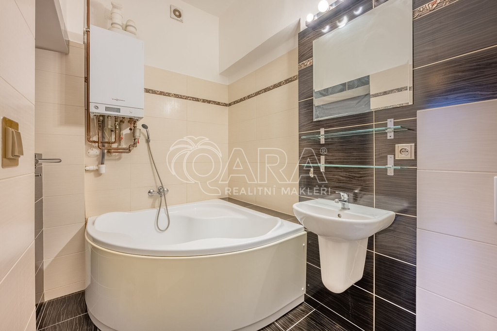 V bytě je plynový kotel, který ovládá topení a ohřev vody.
