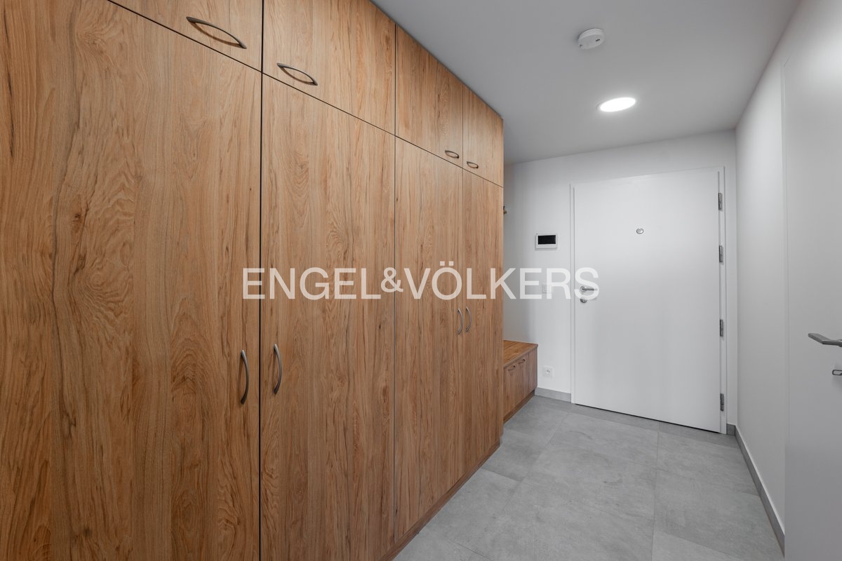 Tento nezařízený byt 2+kk zahrnuje vstupní chodbu, obývací pokoj s přístupem na terasu, plně vybavený kuchyňský kout (indukční varná deska, lednice s mrazákem, myčka nádobí, trouba a mikrovlnná trouba), ložnici, koupelnu s vanou a toaletou, druhou samostatnou toaletu a komoru s pračkou a sušičkou.