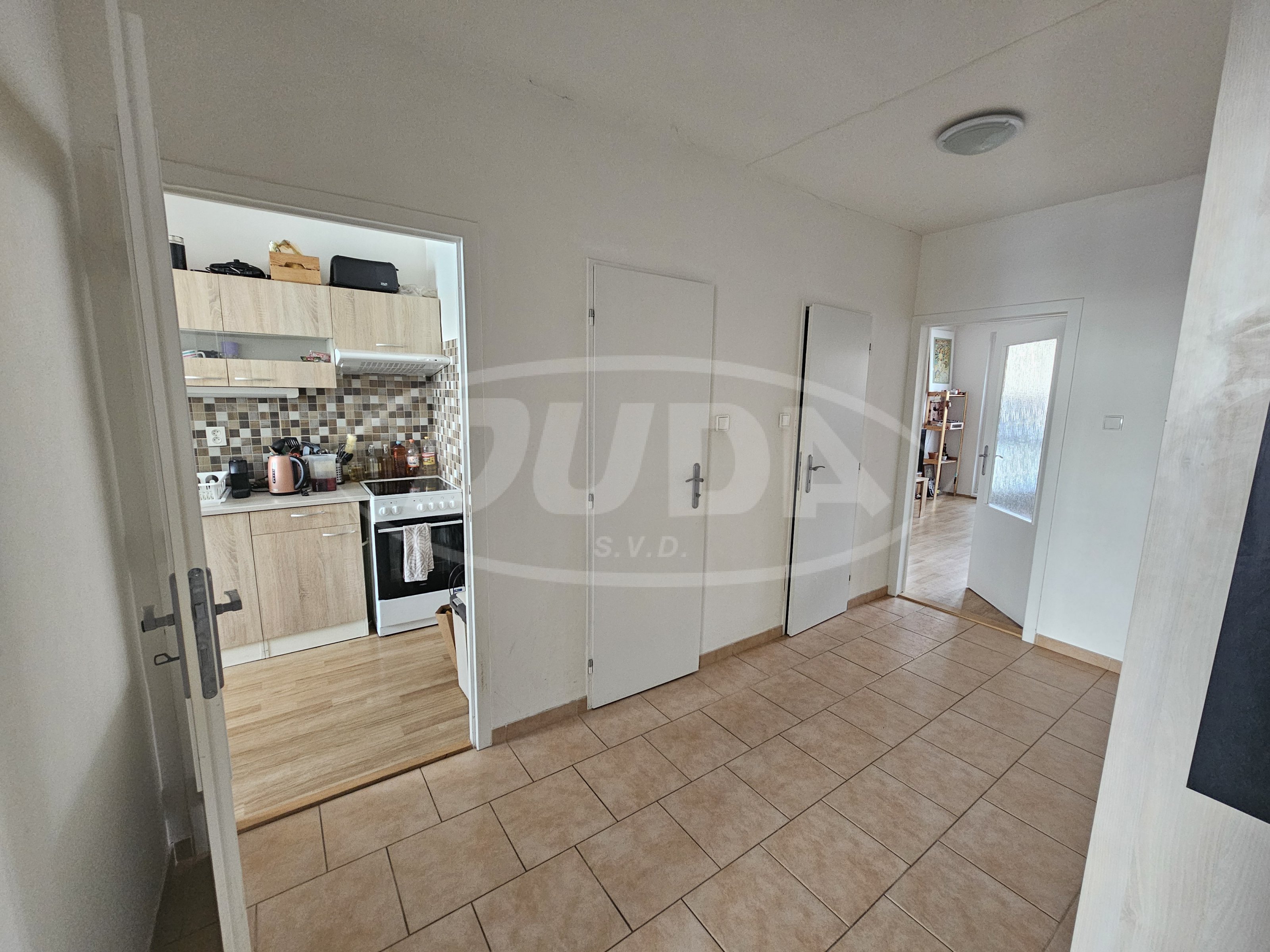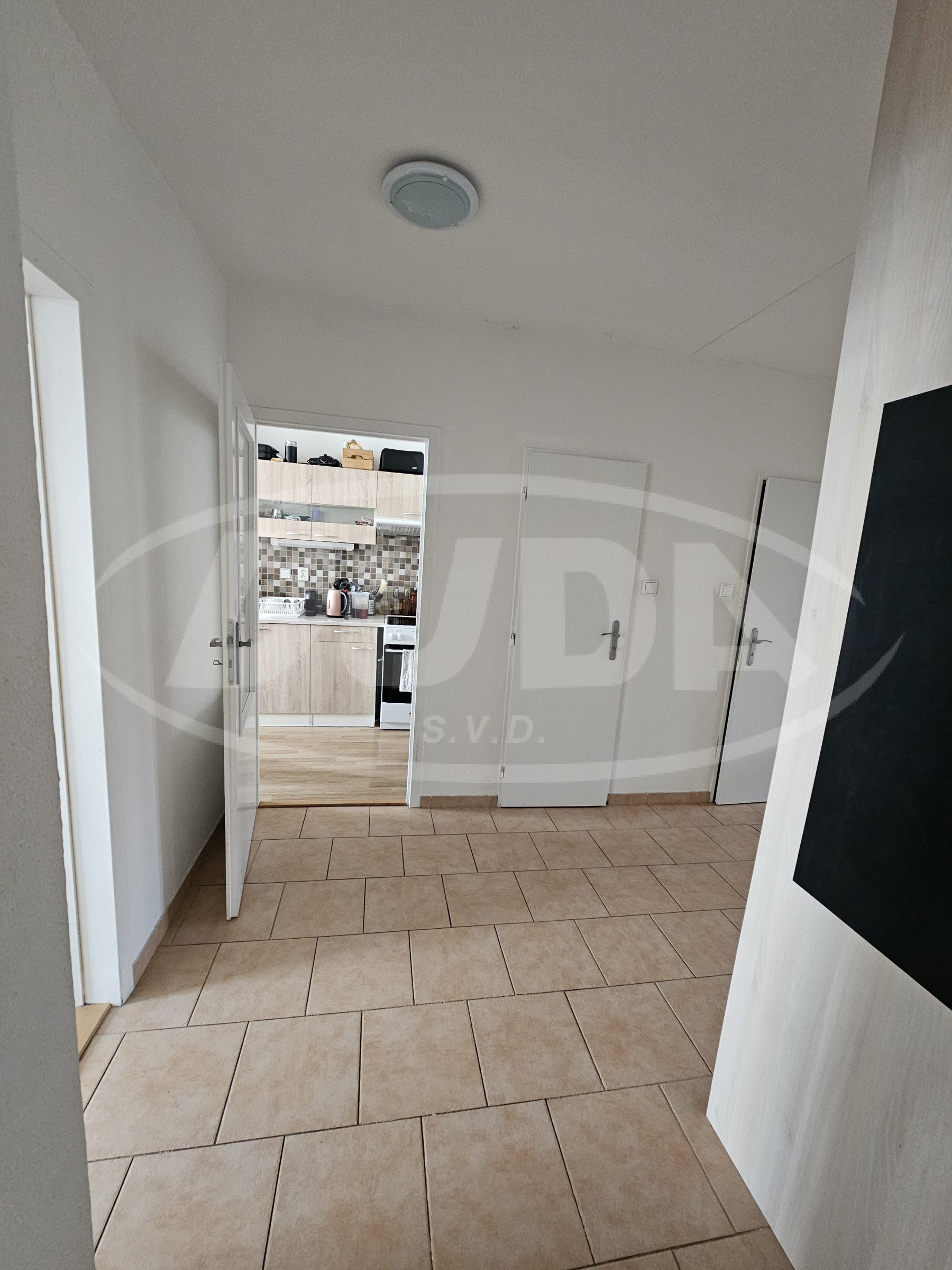 Chodba bytu je dělena na zádveří a hlavní chodbu, kde je umístěna vestavěná úložná skříň.