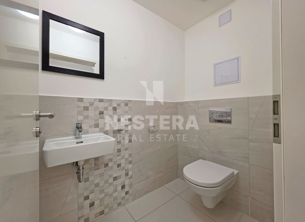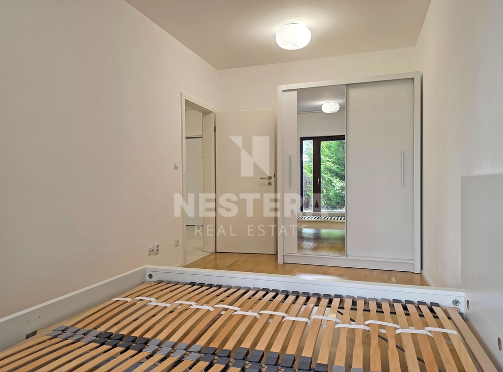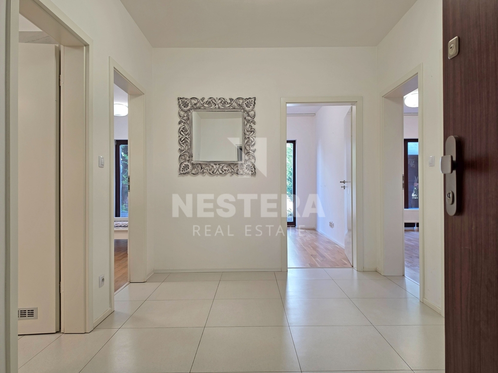 Byt se nachází v přízemí čtyřpodlažní novostavby s výtahem a má západní až severo-západní orientaci. Dispozičně je rozdělen na prostornou předsíň, koupelnu s vanou a přípravou na pračku, samostatnou toaletu, dva pokoje a veliký obývací prostor s kuchyňským koutem (36 m2). Z obýváku a obou pokojů je přístup na zahrádku, kde lze pohodlně relaxovat nebo nechat proběhnout domácí mazlíčky.