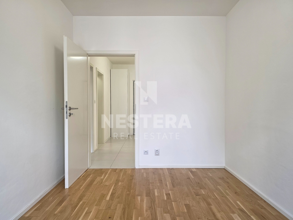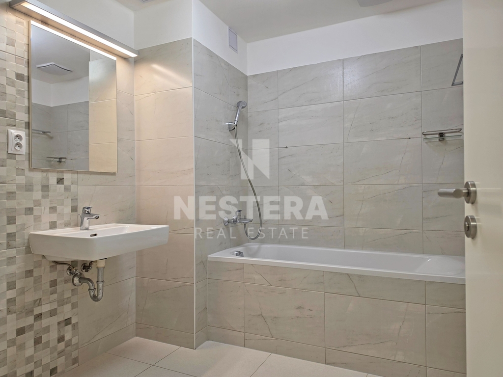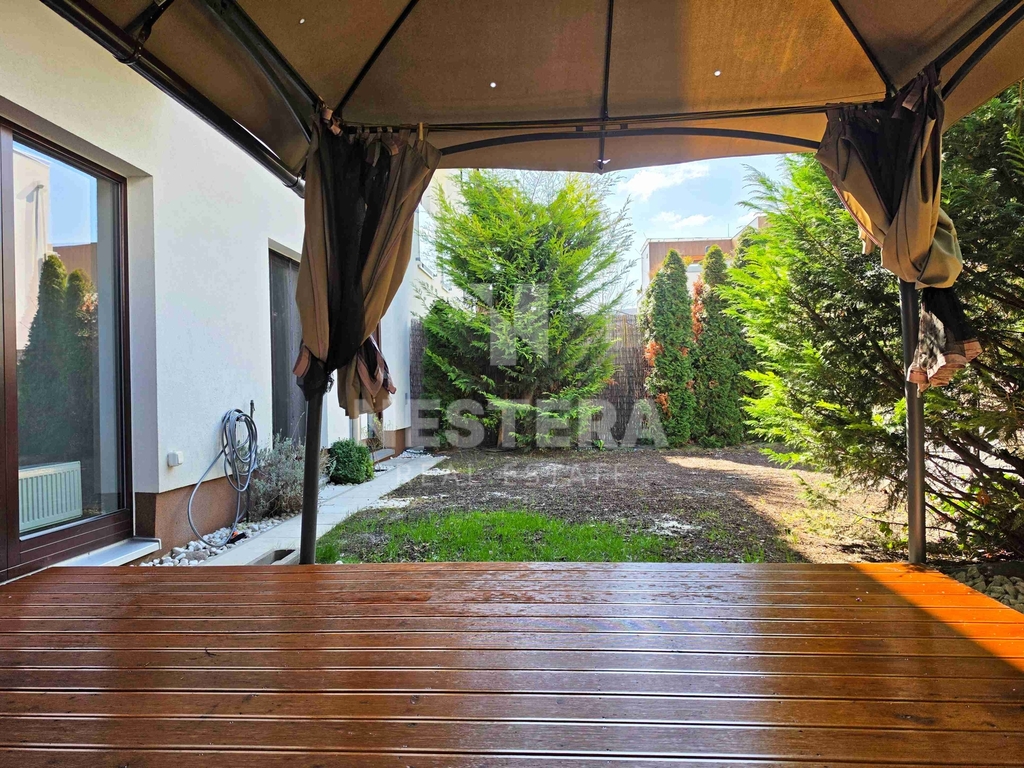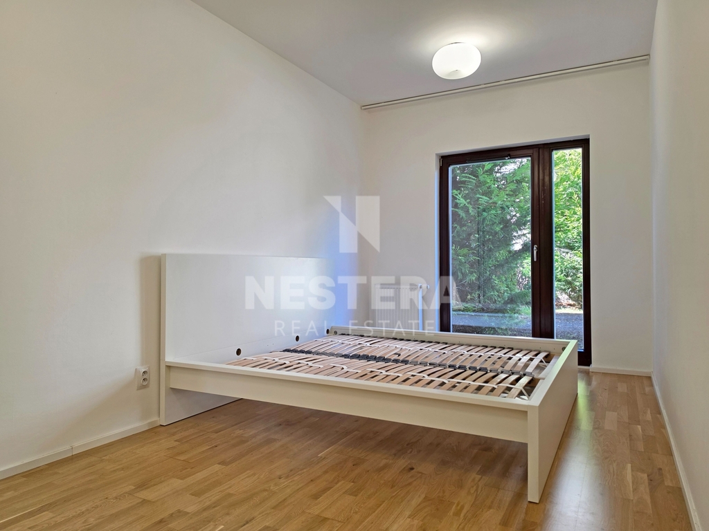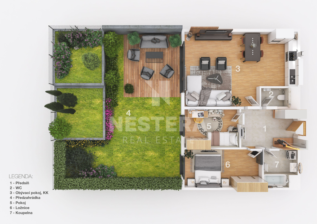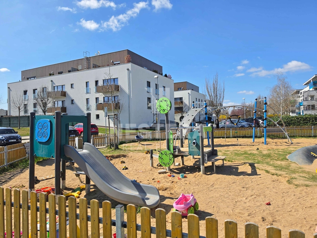 Byt se nachází v přízemí čtyřpodlažní novostavby s výtahem a má západní až severo-západní orientaci. Dispozičně je rozdělen na prostornou předsíň, koupelnu s vanou a přípravou na pračku, samostatnou toaletu, dva pokoje a veliký obývací prostor s kuchyňským koutem (36 m2). Z obýváku a obou pokojů je přístup na zahrádku, kde lze pohodlně relaxovat nebo nechat proběhnout domácí mazlíčky.