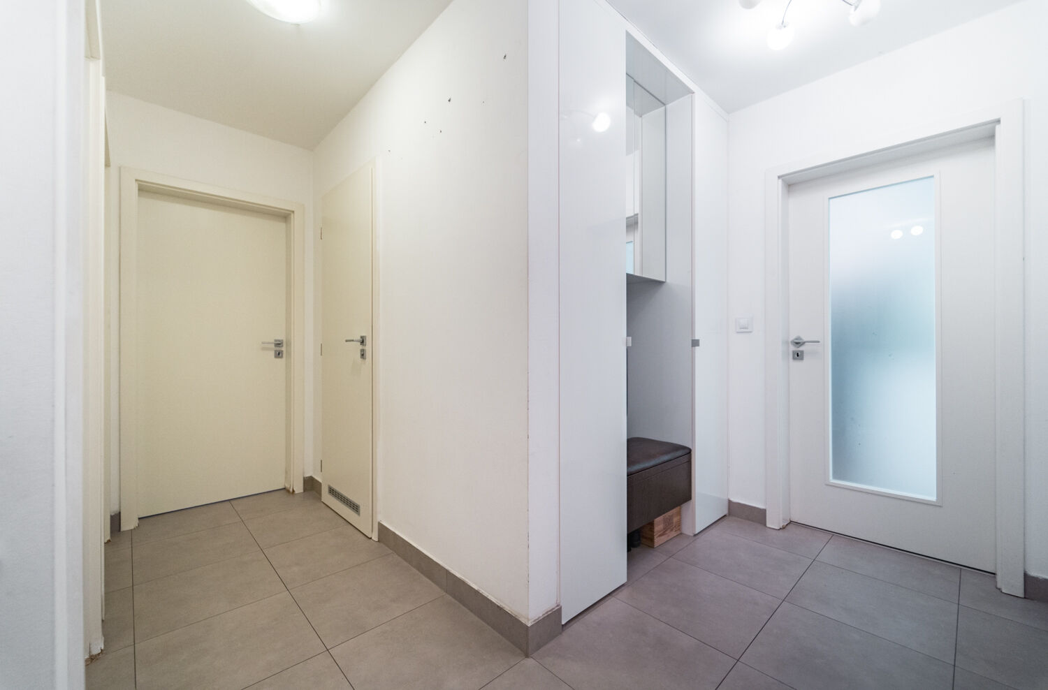 Jedná se o moderně vybavený byt o výměře 65 m2 nacházející se v prvním nadzemním podlaží. Součástí uvedené výměry je předsíň, obývací pokoj s kuchyňským koutem, ložnice, pokoj, koupelna a samostatné WC. Nad rámec uvedené výměry byt disponuje prostorným balkónem situovaným na jihovýchod o výměře 17 m2, což představuje celkovou plochu bytu 82 m2. Součástí nabídky je sklepní kóje a vnitřní parkovací stání.