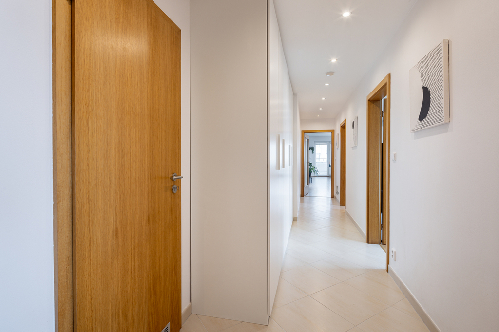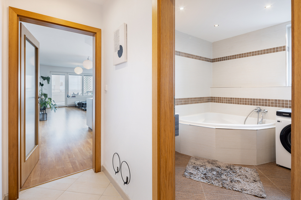 Při vstupu do bytu se nachází předsíň navazující na centrální chodbu, odkud je přístup do prostorné komory a k vestavěným skříním na míru, které poskytují dostatek úložného prostoru.