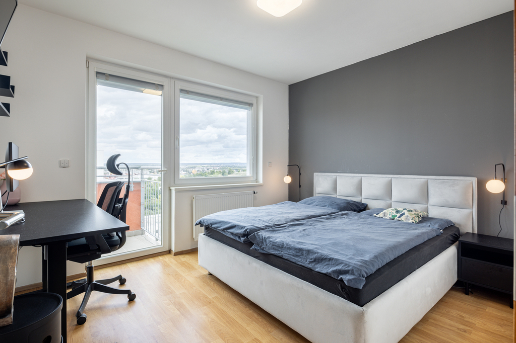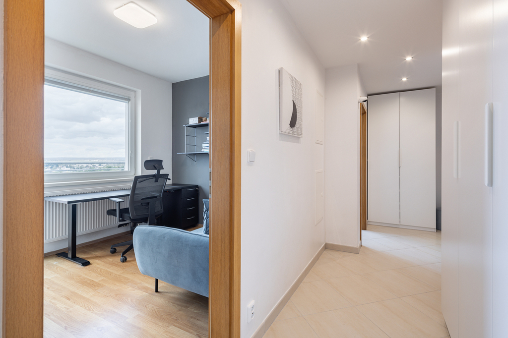 Byt se nachází v posledním, 12. nadzemním podlaží moderního cihlového domu, což zajišťuje výjimečné soukromí, klid a nádherné výhledy do okolí. Díky této poloze je byt velmi tichý a nerušený, což ocení každý, kdo hledá komfortní bydlení.