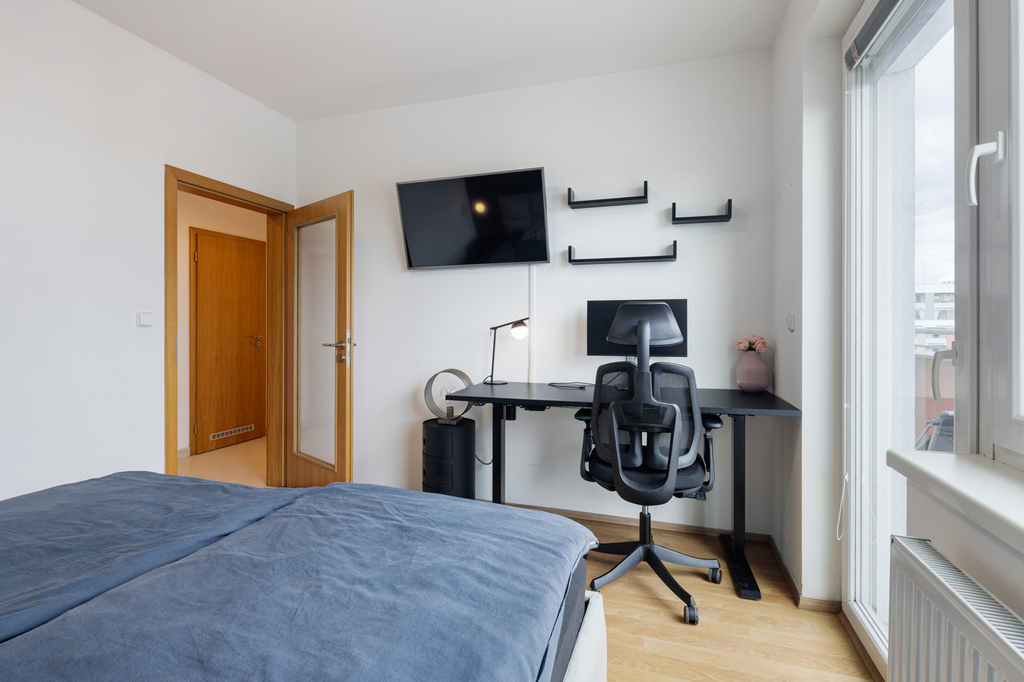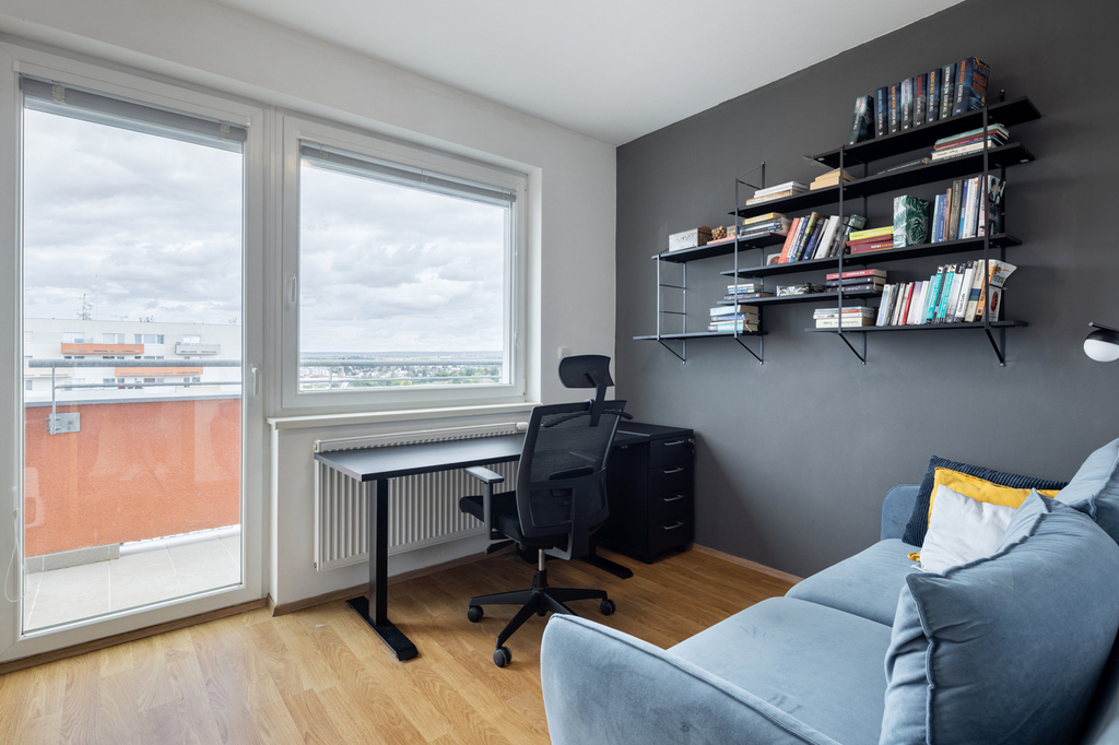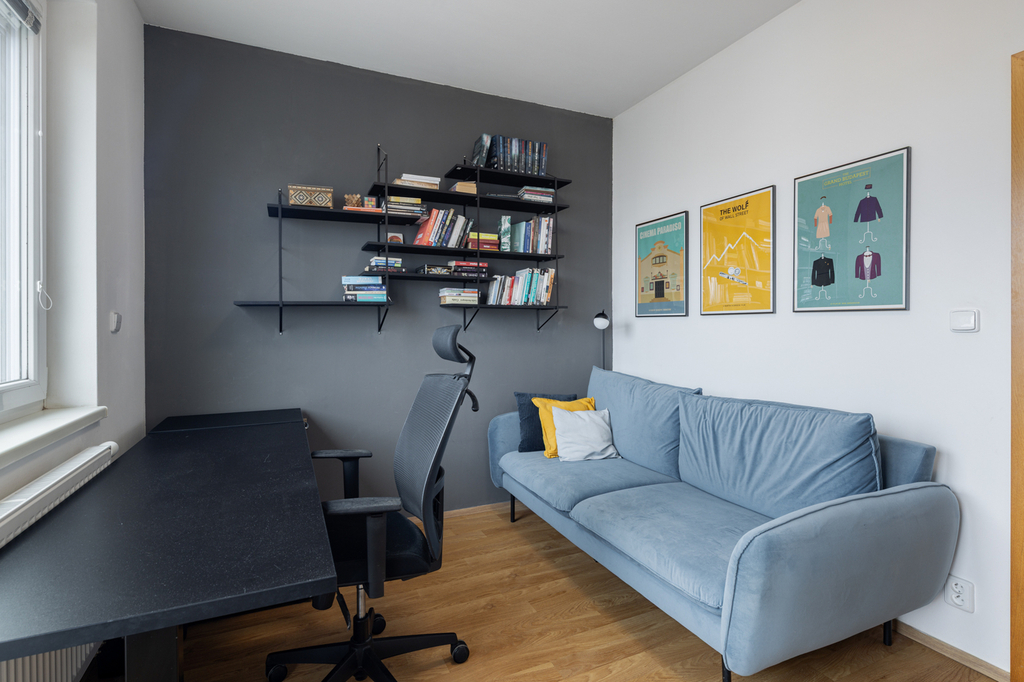 Na ložnici navazuje další pokoj, ideální jako pracovna nebo dětský pokoj. I tento pokoj má zatemňovací rolety a vstup na druhý balkón, který je propojený s obývacím pokojem.