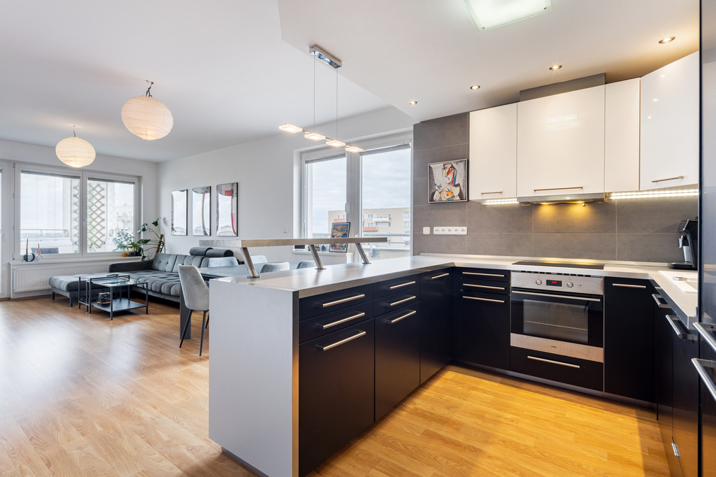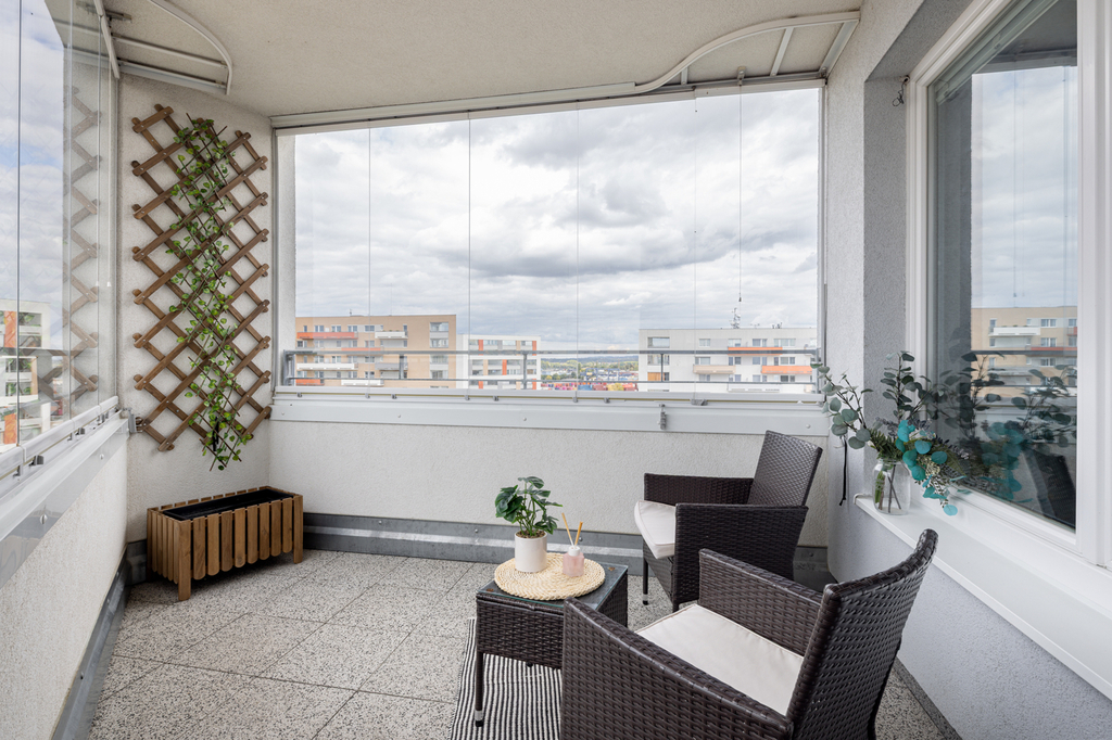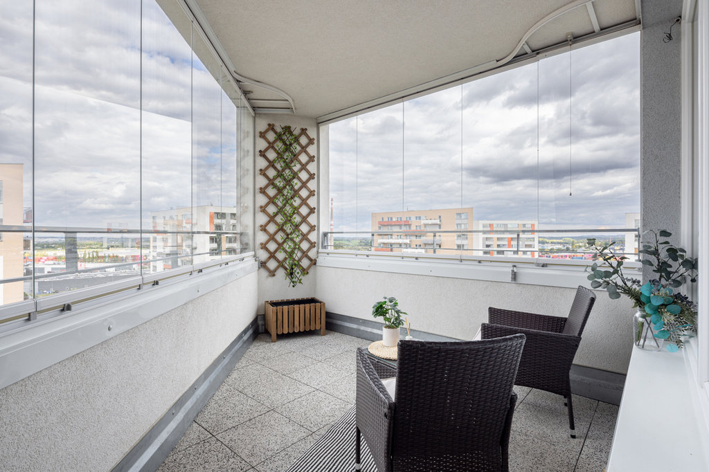 Dispozice bytu je velmi praktická a promyšlená – obytná část je zcela oddělena od klidové zóny. Dominantou bytu je prostorný obývací pokoj s moderní kuchyňskou linkou o rozloze 36 m², který nabízí dostatek prostoru pro každodenní život i posezení s přáteli. Z obývacího pokoje je přístup na jeden z balkónů a také na zasklenou lodžii, která je chráněna před větrem a chladem a lze ji pohodlně využívat po celý rok – k relaxaci, práci i odpočinku.