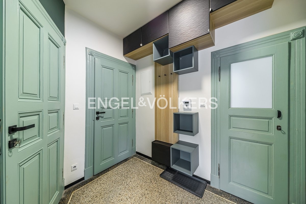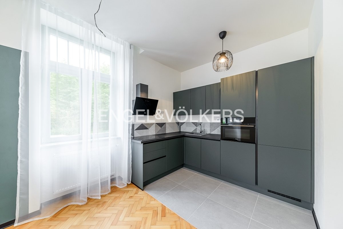 Srdcem bytu je obývací pokoj s novou kuchyňskou linkou, dále dvě neprůchozí ložnice - z jedné je přístup na balkon, koupelna se sprchovým koutem a předsíň. Byt s vysokými stropy a přiznanými původními prvky má originální interiérové dveře, původní repasované či nové parkety a nová dřevěná izolační okna.