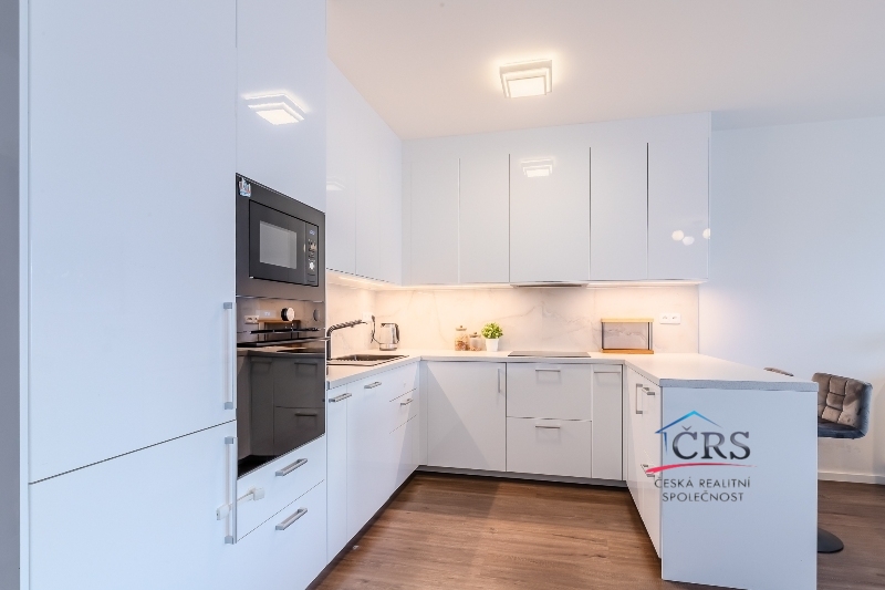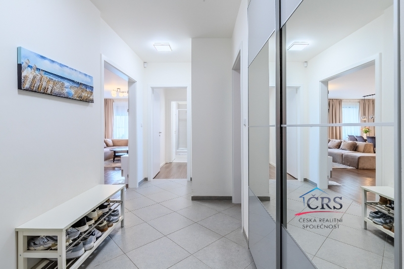 Dispozice bytu nabízí praktické a komfortní bydlení – všechny pokoje jsou neprůchozí, což zajišťuje maximální soukromí, dvě koupelny. Prostorný obývací pokoj s kuchyňským koutem o výměře 43,5 m2 ( kuch. linka s vestavěnými spotřebiči) . Jedna ložnice má svoji koupelnu se sprchovým koutem a WC dohromady, dále prostornou šatnu a balkón. V druhé koupelně je vana a WC. Na podlaze dlažba a vinyl, na stěnách štuky. Byt je vybaven klimatizací v obývacím pokoji pro pohodlí v letních měsících a zabezpečovacím systémem Jablotron.