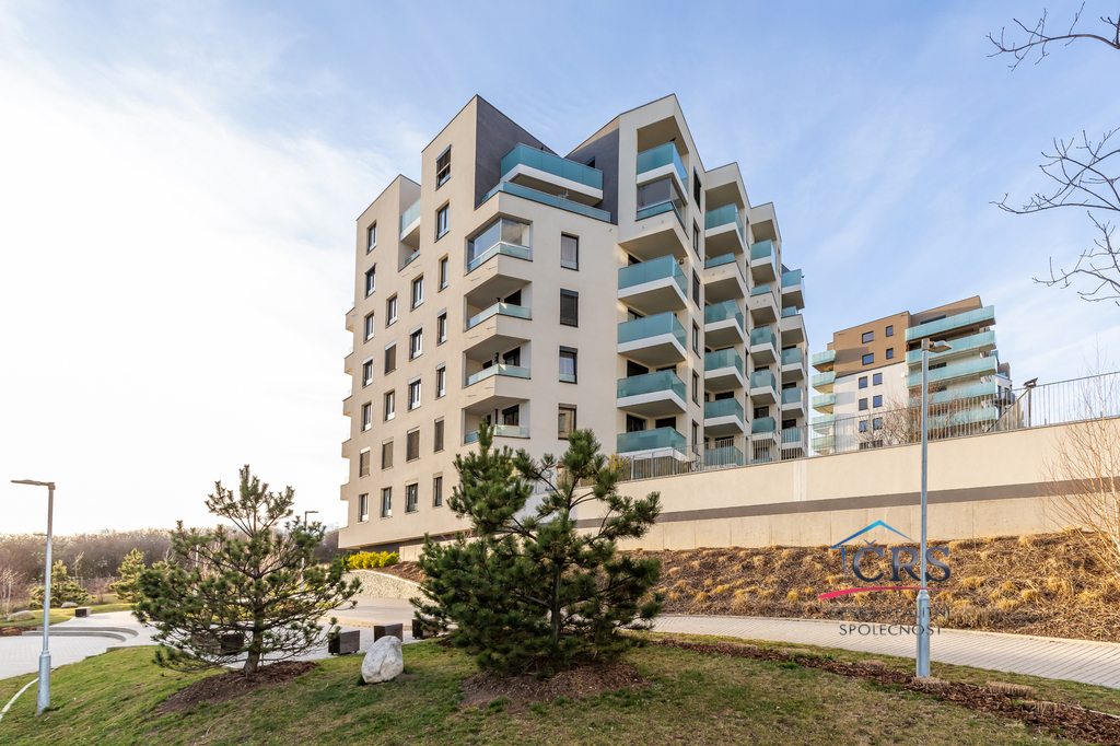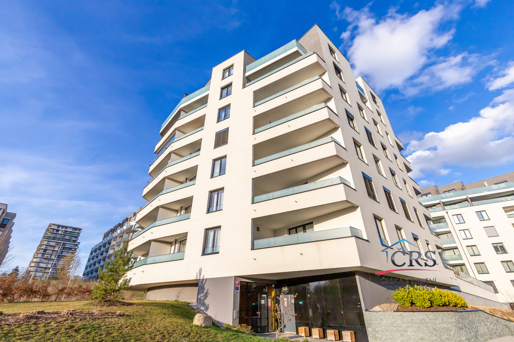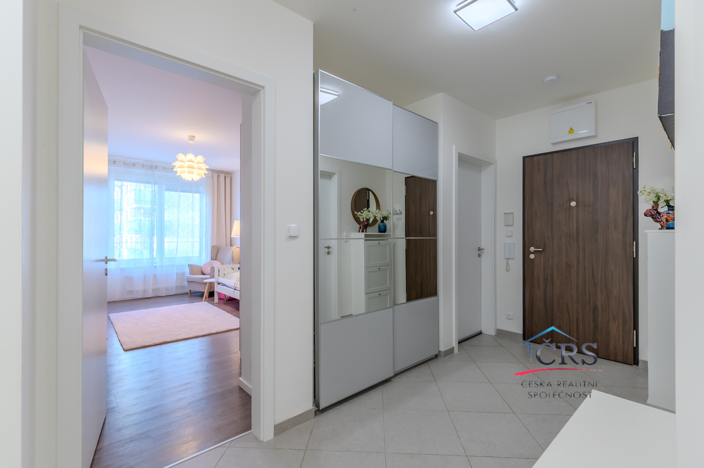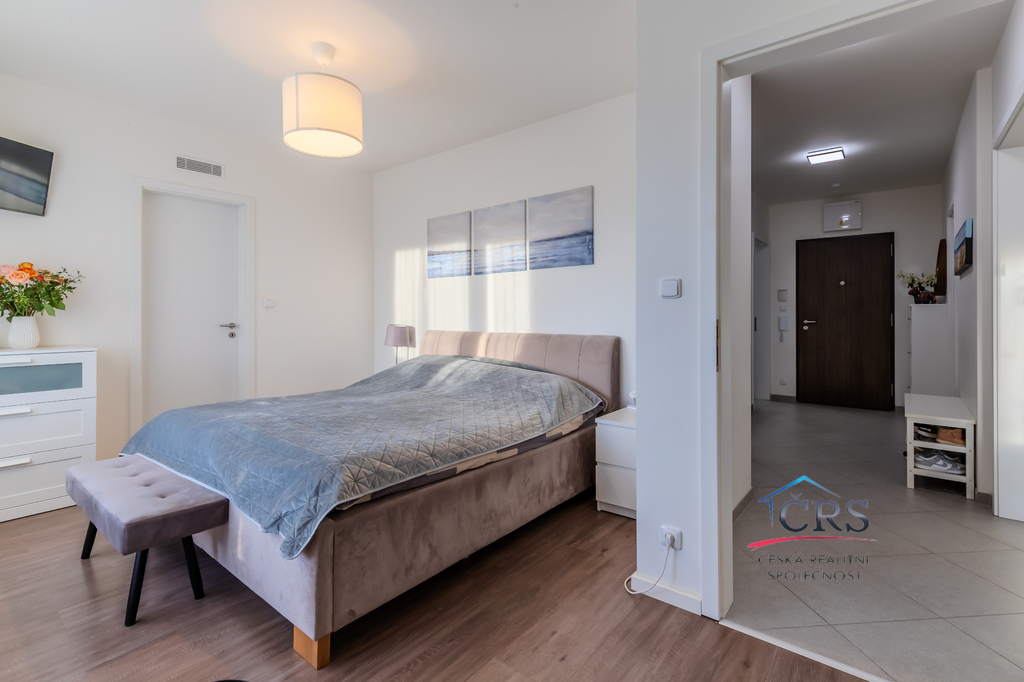 Dispozice bytu nabízí praktické a komfortní bydlení – všechny pokoje jsou neprůchozí, což zajišťuje maximální soukromí, dvě koupelny. Prostorný obývací pokoj s kuchyňským koutem o výměře 43,5 m2 ( kuch. linka s vestavěnými spotřebiči) . Jedna ložnice má svoji koupelnu se sprchovým koutem a WC dohromady, dále prostornou šatnu a balkón. V druhé koupelně je vana a WC. Na podlaze dlažba a vinyl, na stěnách štuky. Byt je vybaven klimatizací v obývacím pokoji pro pohodlí v letních měsících a zabezpečovacím systémem Jablotron.