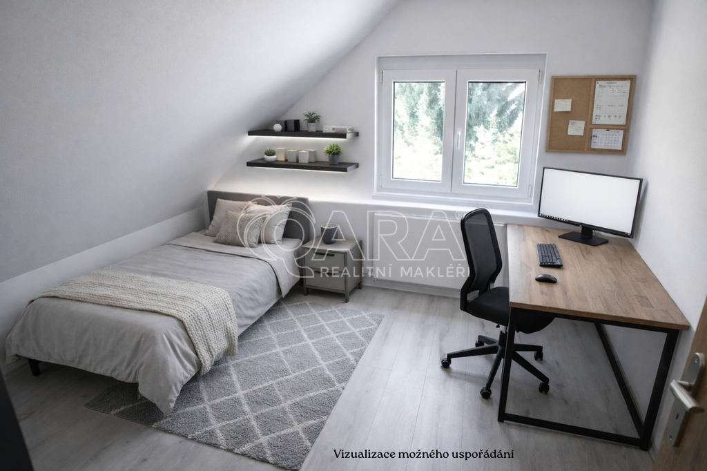 Dispozice bytu nabízí vstupní halu s úložným prostorem, světlý obývací pokoj s kuchyňským koutem, dvě neprůchozí ložnice a jeden průchozí pokoj, který může sloužit jako pracovna, šatna nebo další ložnice. Součástí je koupelna se sprchovým koutem, samostatné WC a praktický podkrovní prostor o velikosti 23 m², vhodný jako sklad, hobby místnost nebo herna.